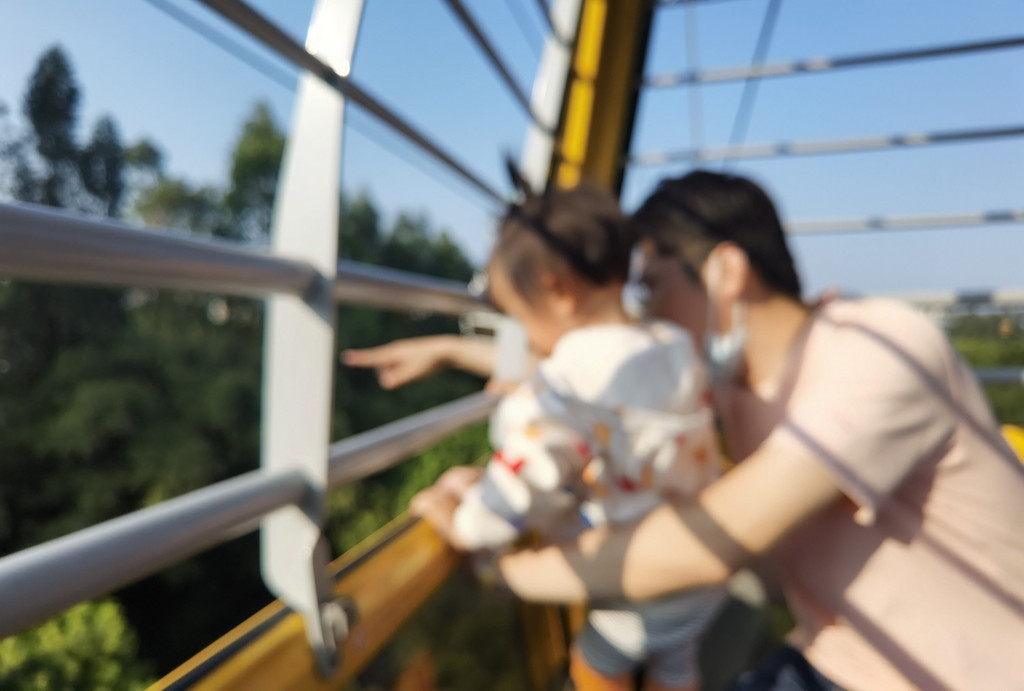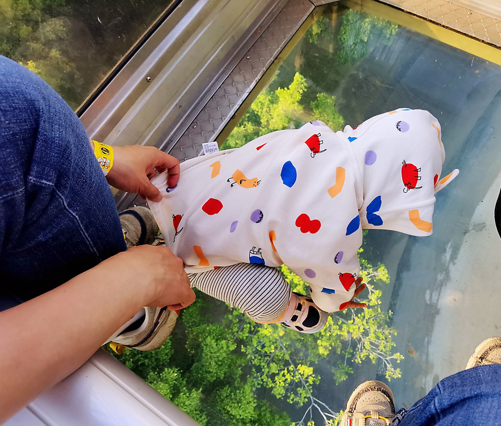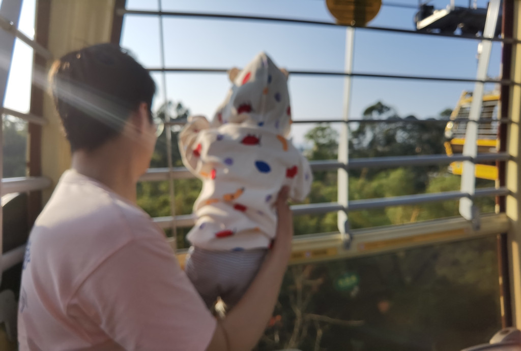 小九喂完长颈鹿之后在推车上睡了快一个半小时,在熊猫乐园附近找了一个可以休息的地方,刚好大人也可以稍微休息一下,奶奶带着小九休息,这个时候我跟粑粑去看了4D电影,并且在熊猫乐园玩了点小小的机动游戏,刚好看完电影,小九就醒了,然后就是接下来的空中缆车。在熊猫乐园站,我们做的是环园的路线,这个时候有快速通道太爽了,以至于我们坐了两次,因为第一次没有坐到透明玻璃底的,粑粑说既然有快速通道不需要排队,那就继续再坐一次。第二次如愿以偿的坐上了玻璃底的缆车。还是挺舒服的,在缆车上,全程大概就半个小时候左右。