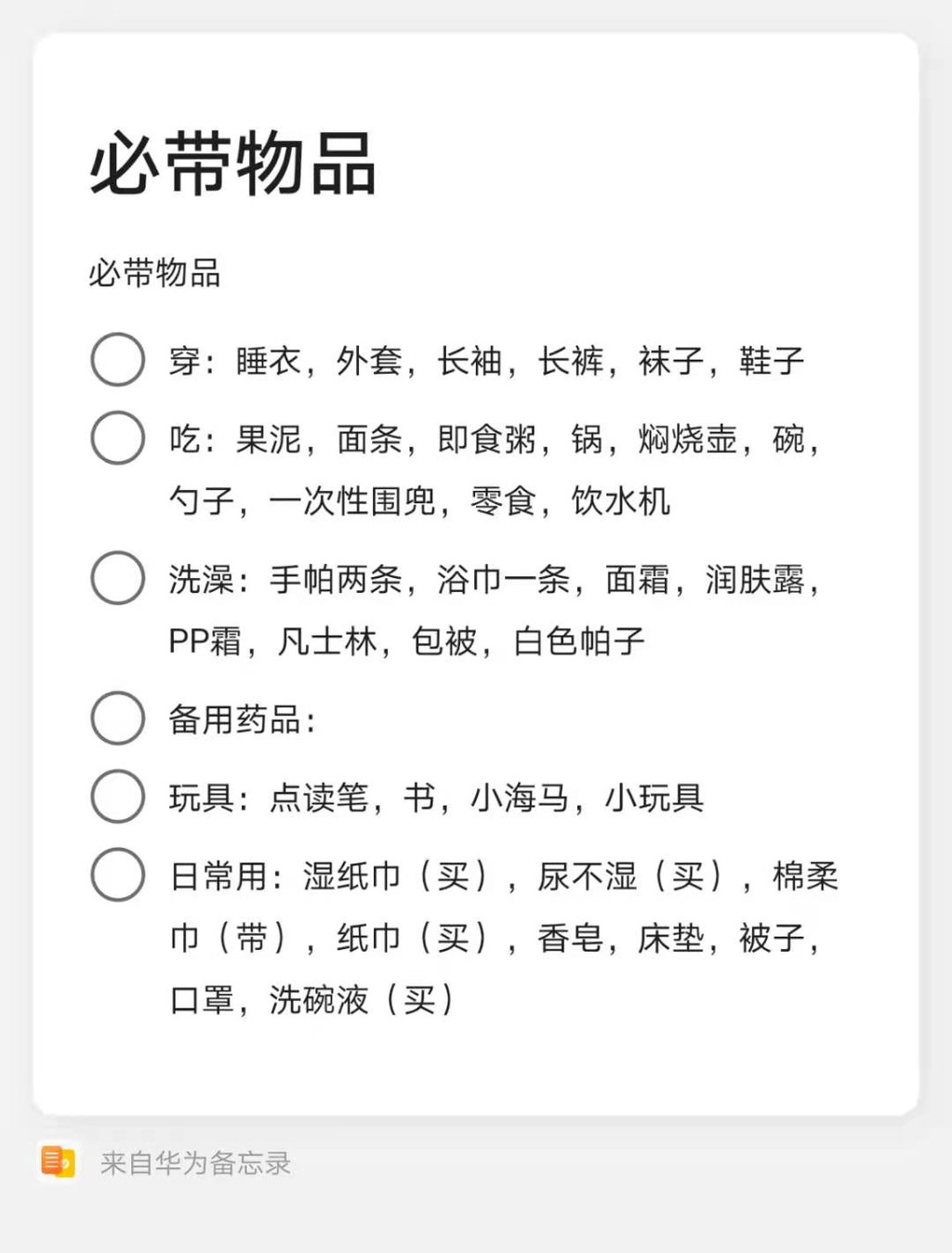 2、带娃出行小tips:虽然小九才一岁半,但是她已经去过厦门,梅州,惠州,最远去了北京。再加上这次去广州,带她出门还是比较轻松的了。但是毕竟小朋友还小,所以一些随行的东西还是要准备好的,以防万一。所以在我的手机备忘录里面,保存着“必备物品”,每次出行,就按照这个准备,也不怕自己忘了些什么。(里面的具体内容可以根据小朋友的年纪进行增减,就像短途的话,我就不会带辅食锅了,因为小九现在已经可以跟大人一起吃饭了)