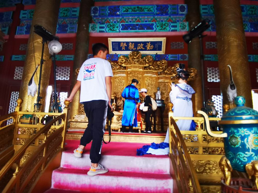 正大光明殿内,游客可以租衣服,登上龙椅拍照。
