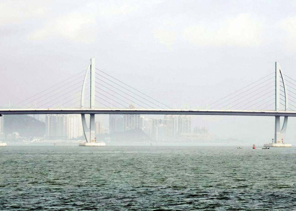 航程中经过澳门的三座跨海大桥,分别是西湾大桥、澳凼大桥和友谊大桥。这应该是西湾大桥。西湾大桥是连接澳门半岛和氹仔岛的第三座大桥,于2002年10月8日动工兴建,主桥于 2004年6月28日合龙。