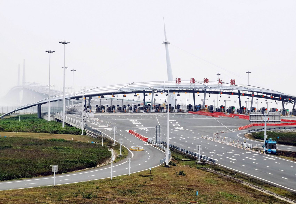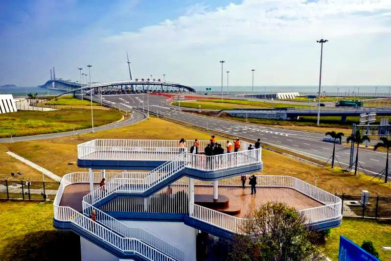 港珠澳大桥东起香港国际机场附近的香港口岸人工岛,向西横跨南海伶仃洋水域接珠海和澳门人工岛,止于珠海洪湾立交。图为在第一个观景台拍的港珠澳大桥珠海公路口岸。