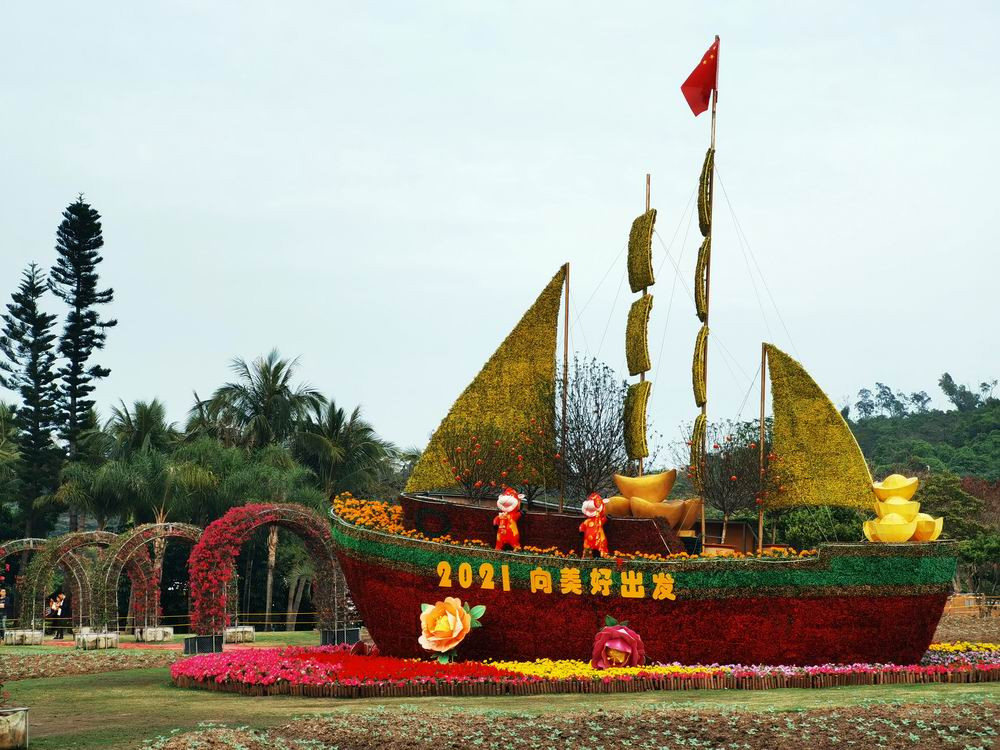 公园的有个大大的草坪,可以供人民野餐露营嬉戏放风筝。草坪上有一艘“2021向美好出发”的花船。