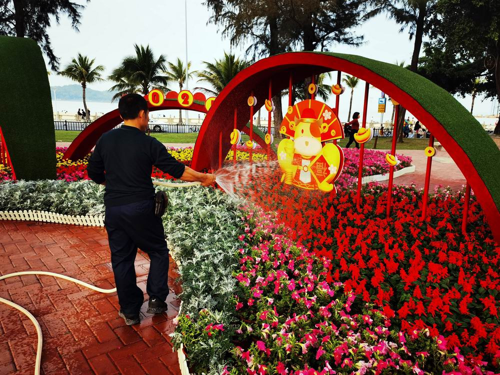 春季,海滨公园的鲜花盛开。图为园林工人在浇花。