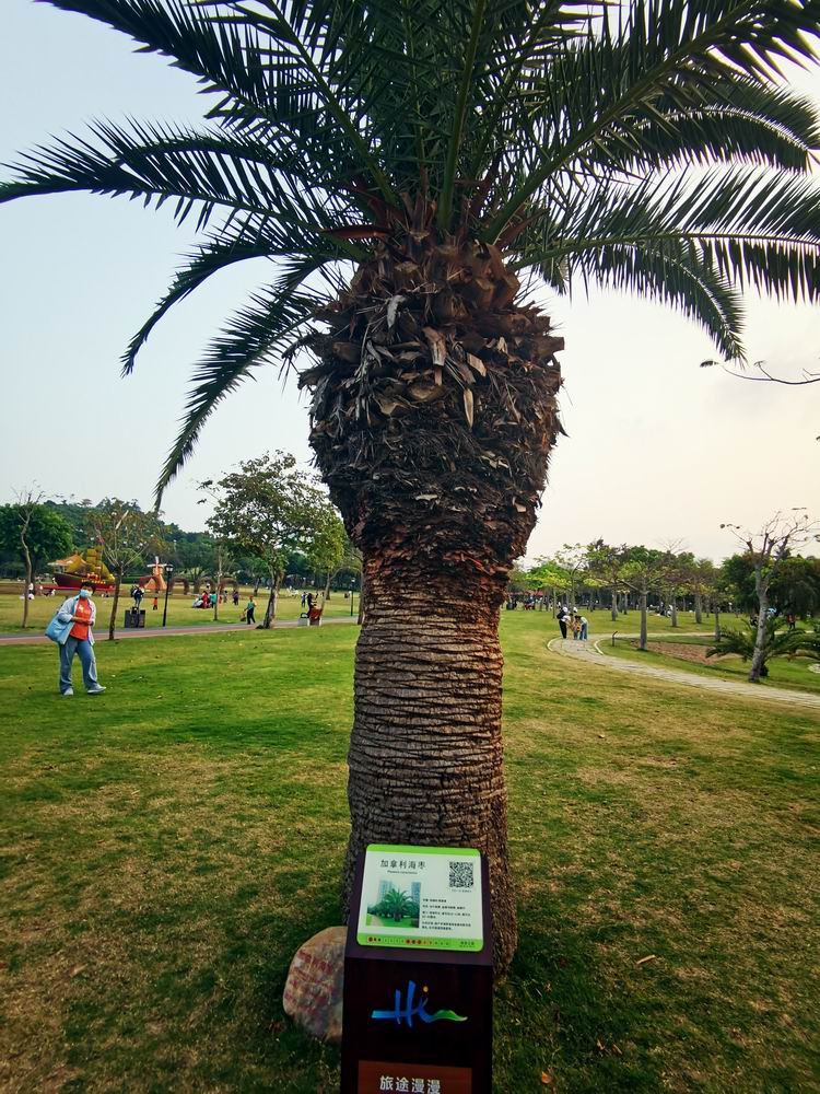 公园里种植了许多热带植物,其中有一片棕榈林,这颗好像叫加拿利海枣树。
