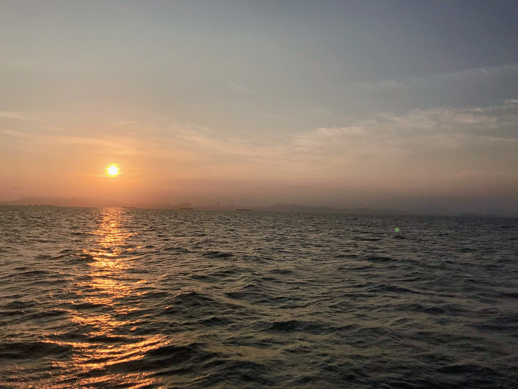 海面拂面,带着远处桂山岛上渐行渐远的人声,我也有点昏昏欲睡,半梦半醒间,我看到了海上日落