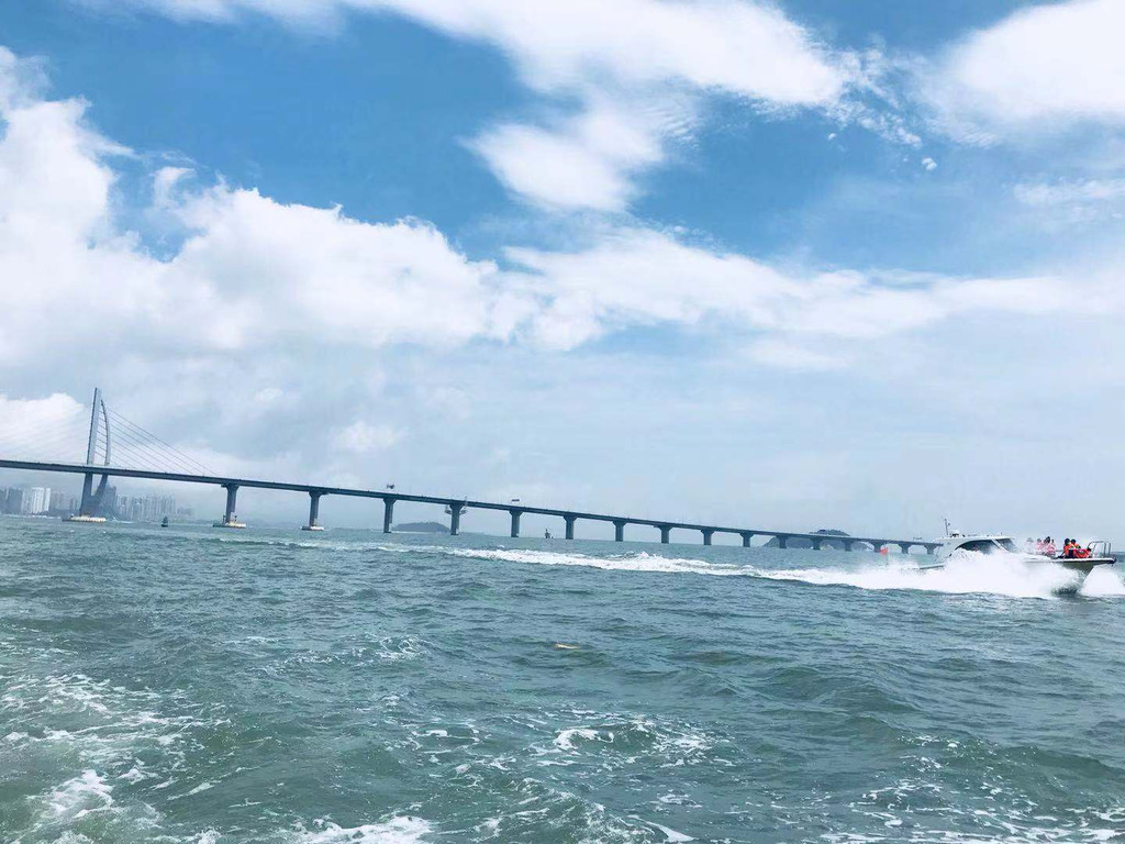 惬意的在甲板上吃着水果聊着天,享受海风拂面的清新,微咸的海风中我们迎来了第一个网红打卡点,港珠澳大桥“风帆”桥塔。