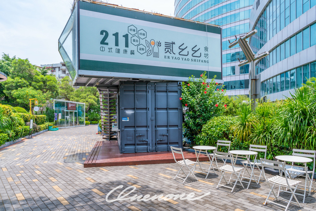 由于珠海是港口城市,多年来的进出口贸易发展,带来了大量废弃的集装箱。为了环境保护,当地对这些集装箱进行了统一废物利用,涂上不一样的色彩,改造成店铺。