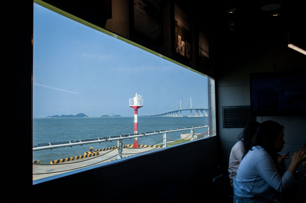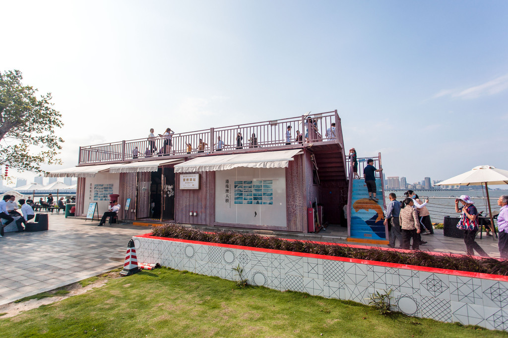 来到望桥驿站,远处望去是一片碧蓝的海水,港珠澳大桥腾跃在海面上,骄傲地绽放它的雄姿。驿站是一间由集装箱做成的木屋咖啡店,箱顶搭建成一个露天观景台。一楼提供明信片寄件服务,你能在这里留下专属于港珠澳大桥的印章。