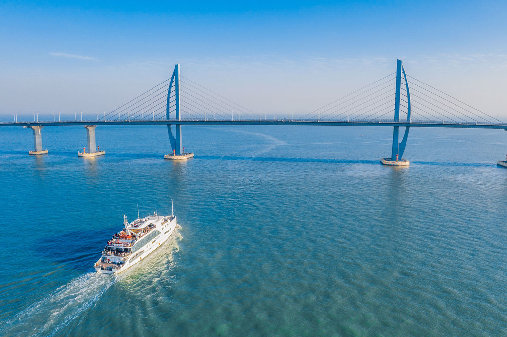 再航行片刻,你能看到跨度268米的“风帆塔”。主塔造型取自”风帆“,寓意“扬帆起航”,与江海直达船航道塔身形成序列化造型效果,桥塔整体造型优美、亲和力强,具有强烈的地标韵味。还未从风帆塔的震撼中缓过神,游船便驶至大桥底部。从大桥下穿过,你能更近距离地观看港珠澳大桥桥身,感受国之重器的震撼。紧接着,航行至海豚塔。一眼望去,仿佛三只巨型“海豚”横越桥面。海豚塔为江海航道桥,是港珠澳大桥的重要标志性建筑之一。