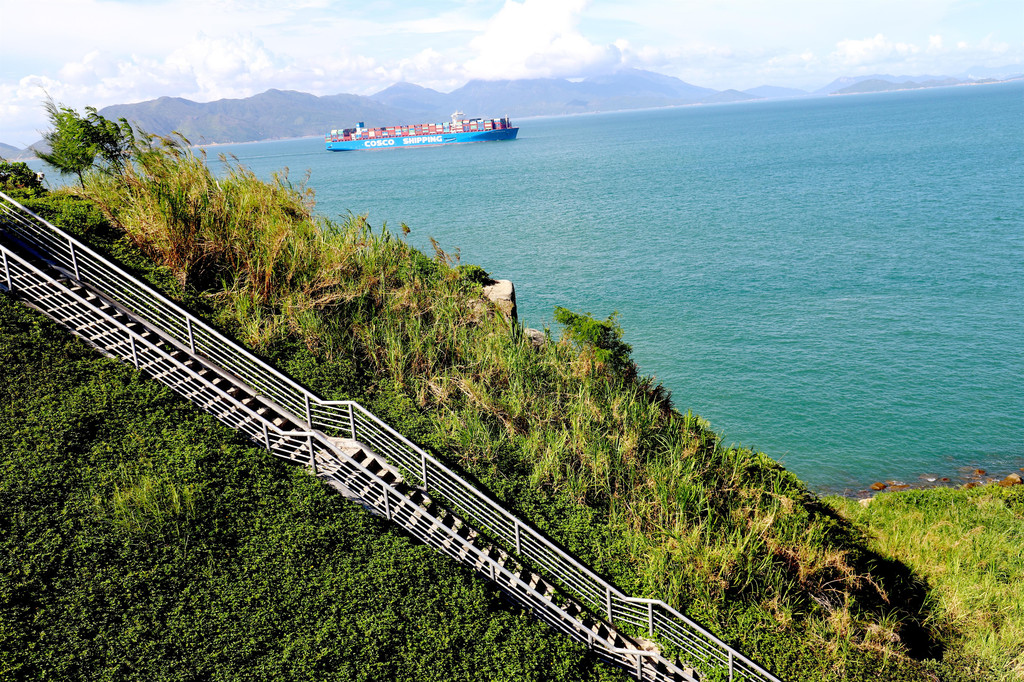 来到桂山岛,一定要逛逛北山水库,这里能看到香港的大屿山,出片率极高的“网红阶梯”便在这里。