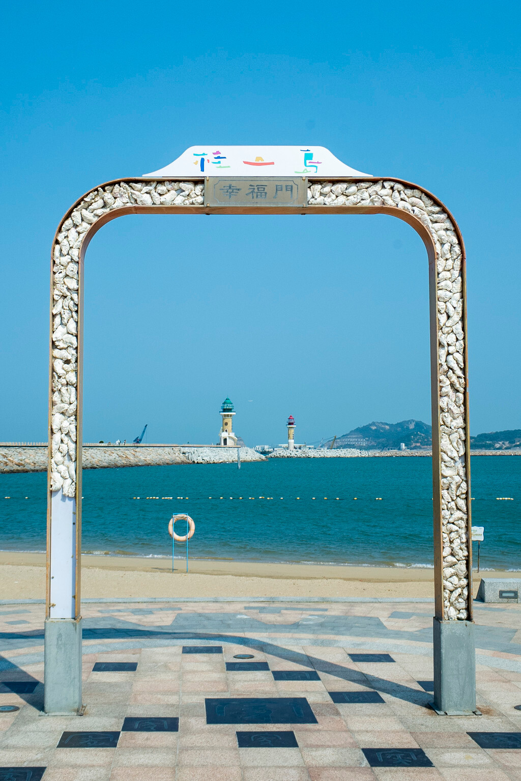 沙滩旁有座镶嵌着生蚝壳的装饰框——幸福门。两座防波堤恰好被门框囊括在内,以蓝天大海作背景,框出一幅油画般的景别。