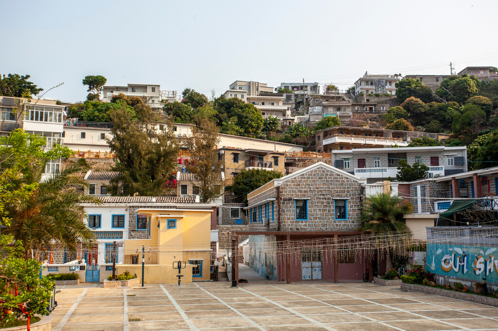登上渔村高地,可俯瞰整个桂山岛。村落里,高低错落的石屋井然排列,蔚蓝无垠的海岸与天空连成线,海面上渔船星星点点,宁静的自然与渔村相融于一景。