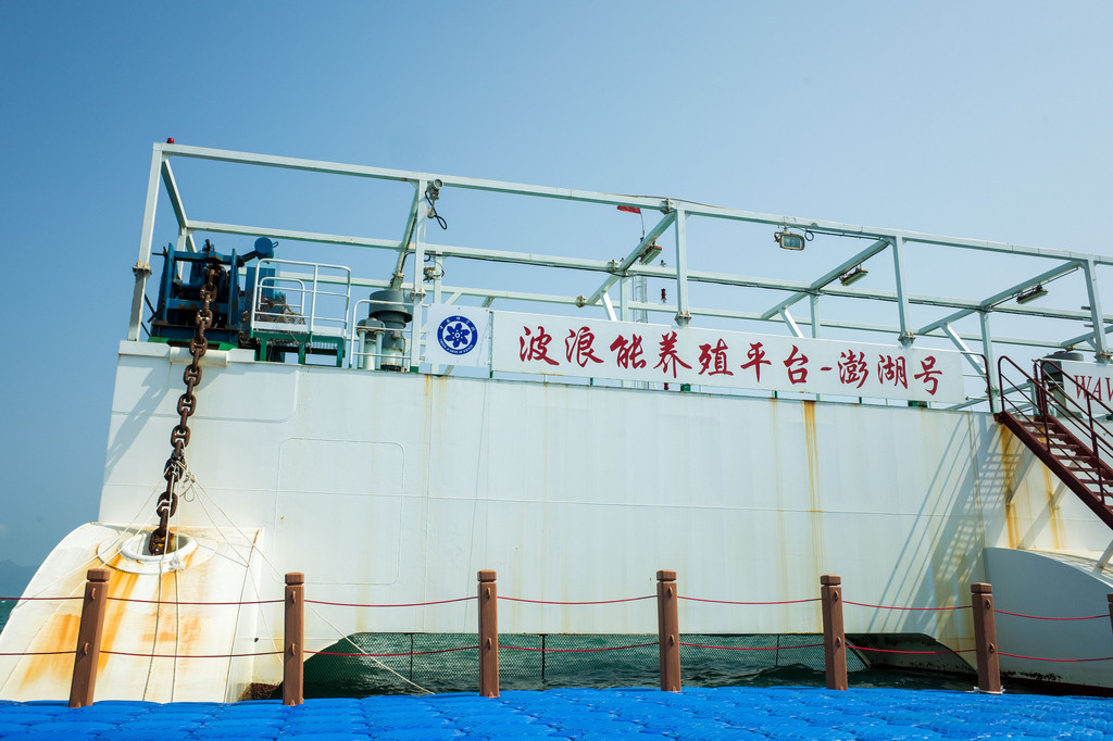 第二天一早,我们便前往1号堤乘坐快艇准备出海!快艇随着浪花上下起伏,20分钟后,一座白色的“海上堡垒”屹立在海面上。这就是海上“黑科技”:“波浪能养殖平台—澎湖号”。