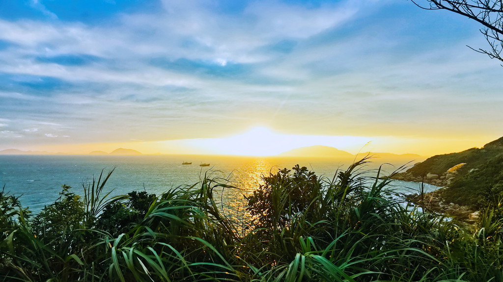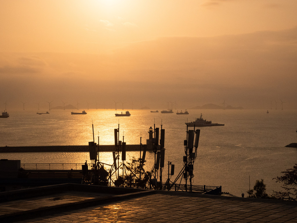 在桂山岛,观赏日出的最佳地就是北山。暮色四合,一轮红日慢慢消失在海平面。余晖编织成醉人的晚霞,眼前辽阔的海面揉碎了夕阳,折射出粼粼橘光。