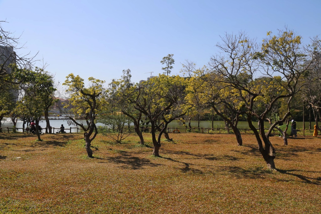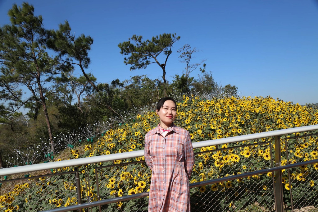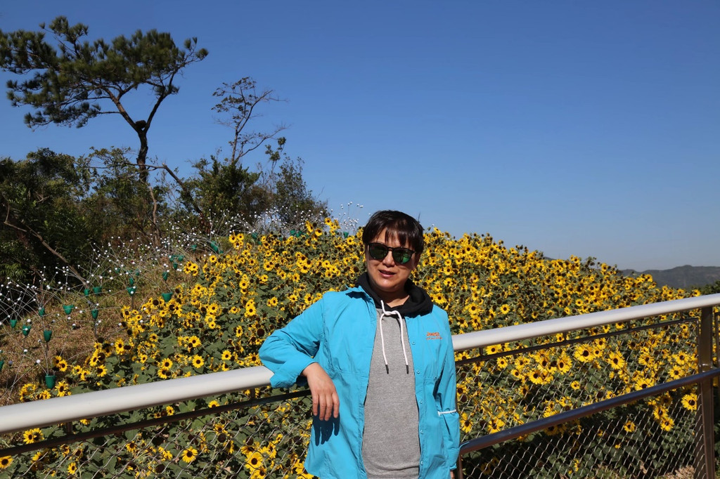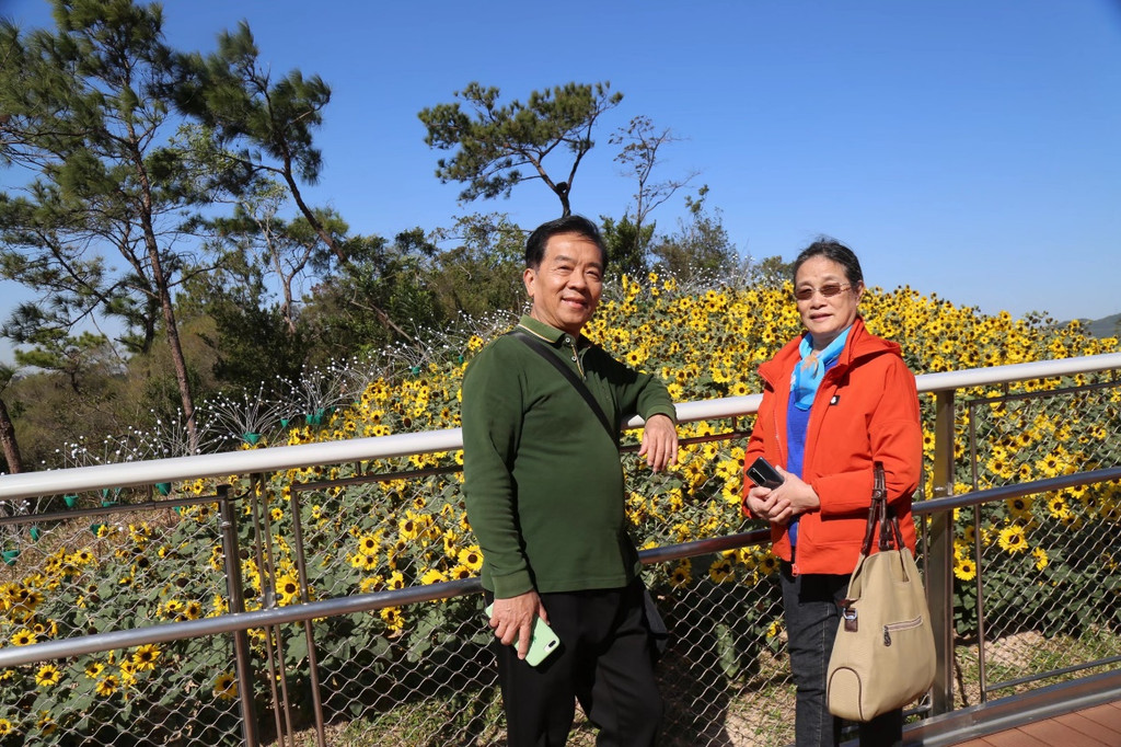 初冬的珠海,天高气爽,同事的到来,阳光更加柔和而温暖。早餐以后,直奔香山湖公园。这里是凤凰山森林公园的一部分,位于凤凰山西南角,东与大镜山水库、北与梅西水库毗邻。人脸识别入园,沿着空中步道,踱方步,深呼吸,观景、洗肺两不误。用塑木铺砌而成的步道,沿山势盘旋而筑,没有台阶,只有高差,行走其间,头上蓝天飞鸟,脚下绿树茵草,湖里天鹅游弋,林中鸟儿欢叫,更有向日葵不知疲倦地绽放她灿烂的笑靥。
