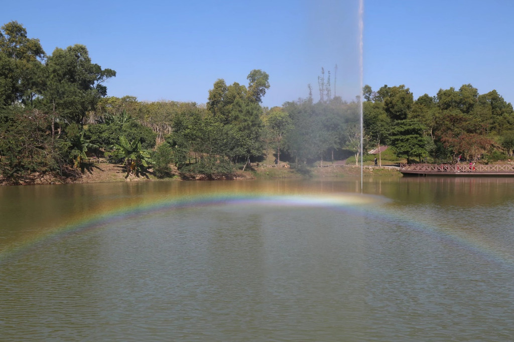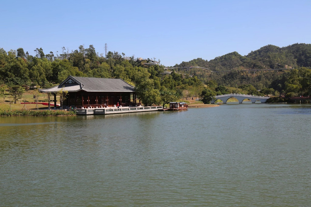公园遵循崇尚自然、师出自然的原则,通过最大限度地保留原有山水草木的景观优势,结合传统的岭南建筑风格,植入岭南园林经典造景,让人工雕琢与自然美景“天人合一”。亲水栈道环湖依水而建,处处环绕,亭、台、楼、榭、桥于不经意间藏身于自然景致中,古朴而典雅,与别致的栈道交相辉映。湖中最耀眼的建筑是白玉桥,洁白若玉,与青山绿水相映成趣;湖边最大的楼榭是洗心亭,波光潋滟,意境幽远。第一次来香山湖公园时,有一退休的领导夫妇陪同。近两小时徒步后,大家想进去歇息片刻,被叫止步。“洗心”自然会联想“革面”,因不是宗教场所,这样的命名似乎有失偏颇。