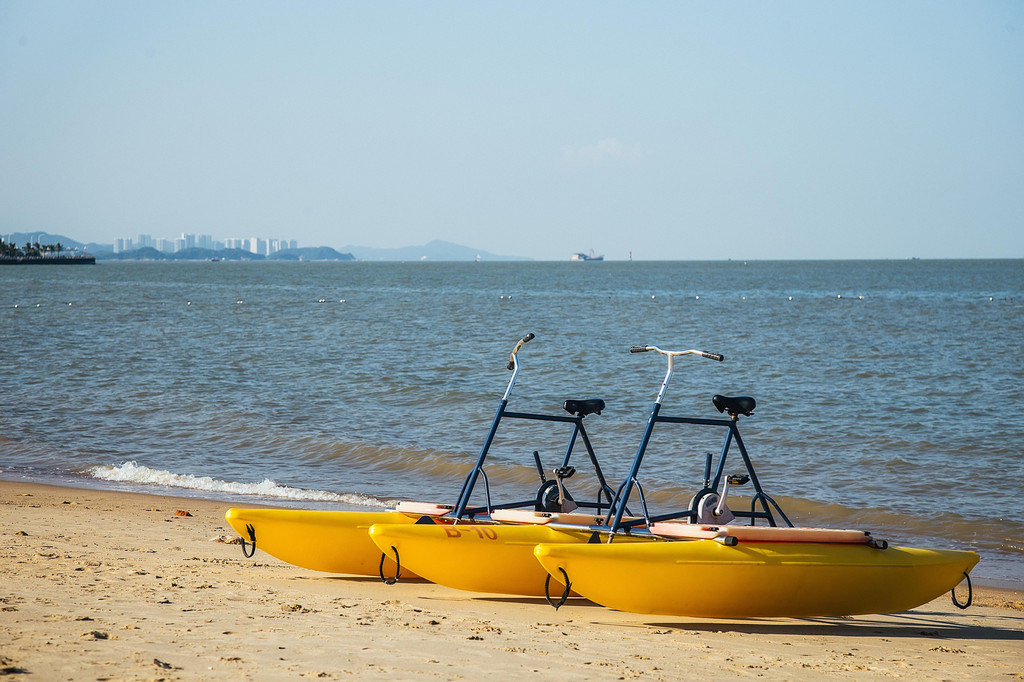 看到前方热闹的香炉湾沙滩,我们不由得加快踩脚踏频。半月形的海湾沙滩,金色的细沙沿着海岸绵延,与沙滩绿地、雨水花园等景观设施相互融合。海水清澈,天空湛蓝,放空大脑在沙滩上吹吹海风,“虚度时光”才是此时此景下最应该做的事。