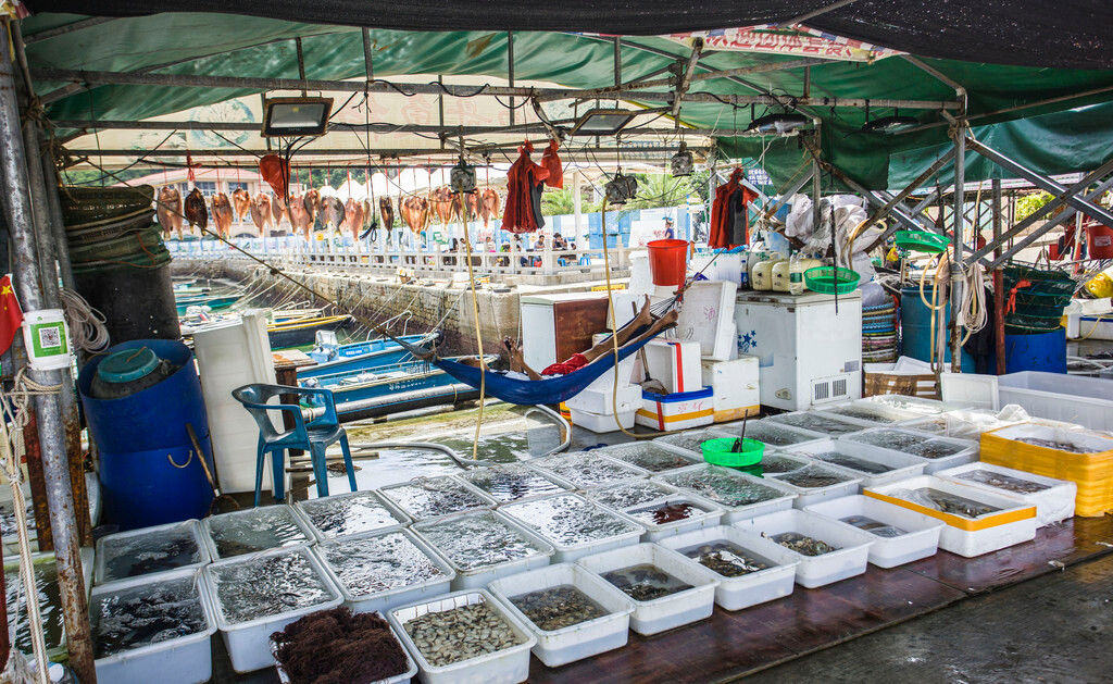 码头左侧,几间海鲜渔档组成了岛上唯一的“海鲜一条街”。东澳岛海产丰富,渔民每天打捞新鲜上岸的海货。你可以从码头档口挑选海鲜,然后拿到餐厅里加工,如果运气好的话,还能碰到东澳三宝:石九公、将军帽、狗爪螺。