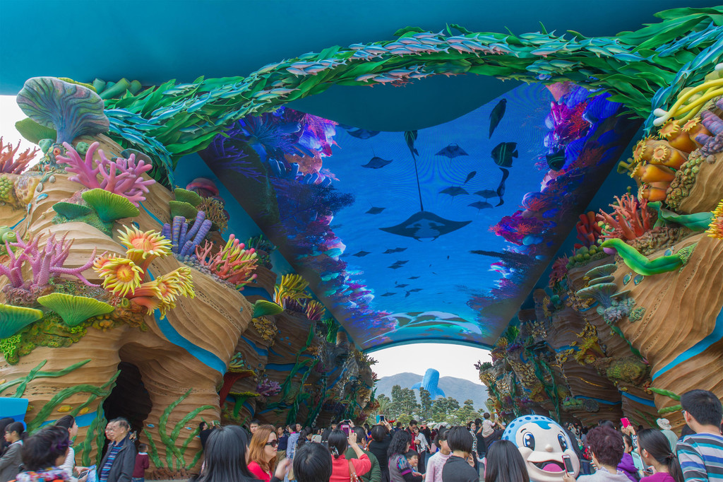 在八大主题园区内,一时仿佛闯入热带雨林,一时仿佛置身神秘的南极北极。近距离地欣赏嬉闹翻腾的海豚,观赏到遨游在深海中的巨型鲸鲨,密密麻麻的鱼儿在身旁游过,透过玻璃欣赏极致壮阔的海底世界,在冰雪世界中与一摇一摆的企鹅、北极熊打声招呼,感受海狮海象敏捷的身手,体验各种沉浸式的娱乐设施,尝试乘坐全球最长的飞行过山车,享受在空中自由翱翔的刺激动感,沉浸在海洋主题的专属故事中。