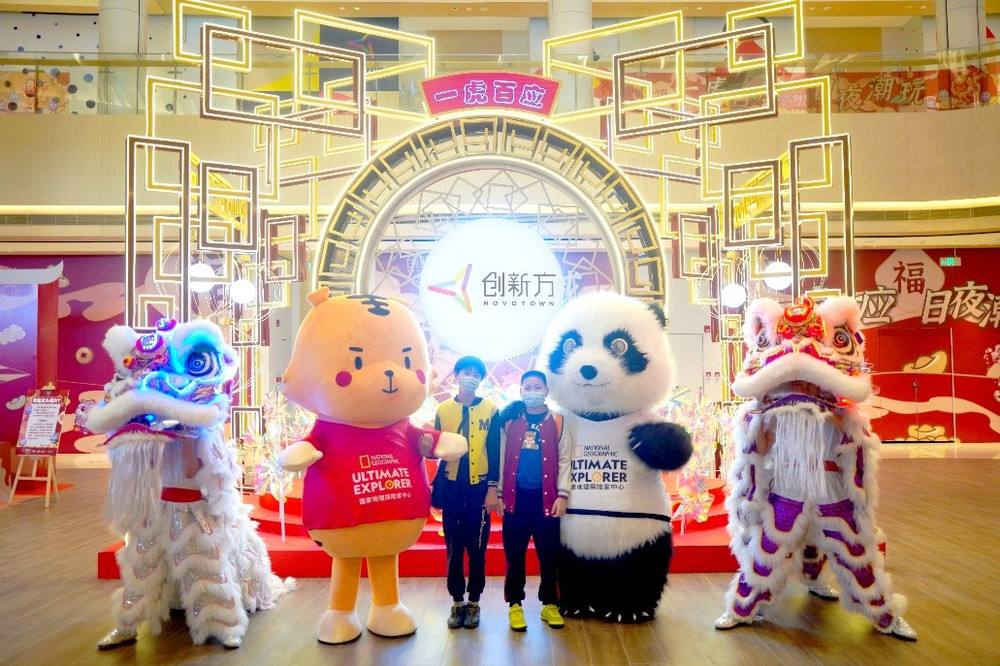 ( 狮门娱乐天地的霓虹狮子,国家地理探险家中心的探险虎、熊猫小吃货与游客合影留念)