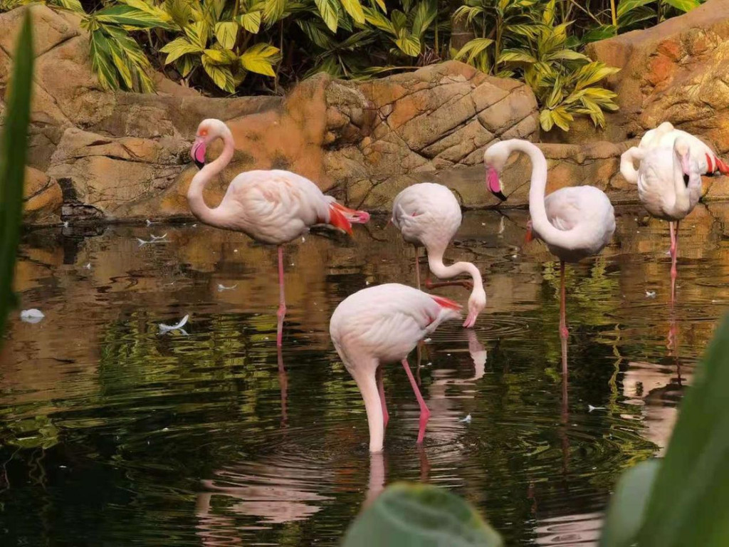 在长隆,不光是要在景区里面玩,还特别建议大家住这边的酒店。酒店环境简直太好了,看我们酒店里面的火烈鸟,真的超级好看。这些是淡粉色的,我们还看到了深红色的火烈鸟,颜色更好看。