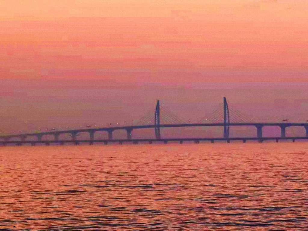 这里便是情侣路日落了。到了傍晚时分,也确实有很多情侣在这里看日落。夕阳的余晖洒在海面上,整个海面变成了深红色的,特别热情的感觉。远处的港珠澳大桥就这样在面前展现着。很想要沿着这条路去香港玩一圈,或者是去澳门玩上一圈。当然,只能是想象了。