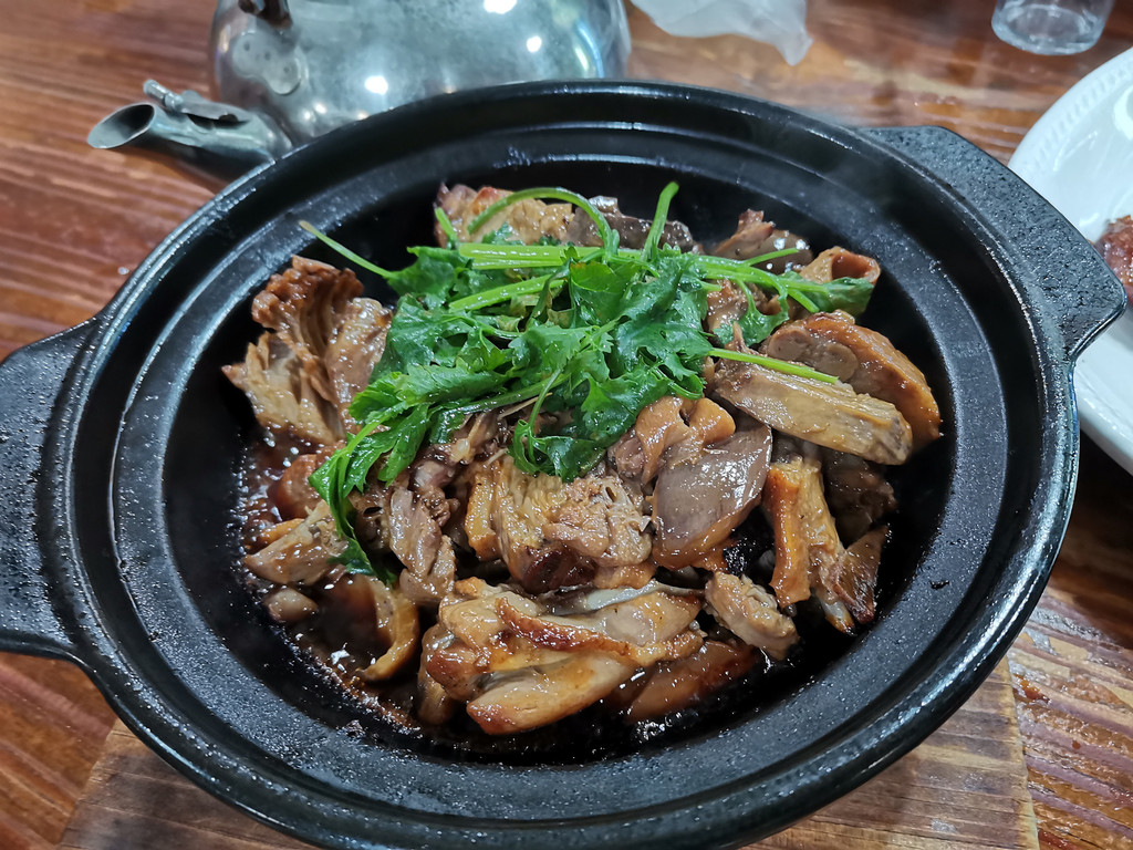 密制砂锅鸭。口味非常特别,咸、甜、香混搭,肉质滑嫩,料汁浓郁。口感偏甜但又是那种甜而不腻的感觉,再甜一点点就会很腻,厨师在这方面拿捏的非常到位。