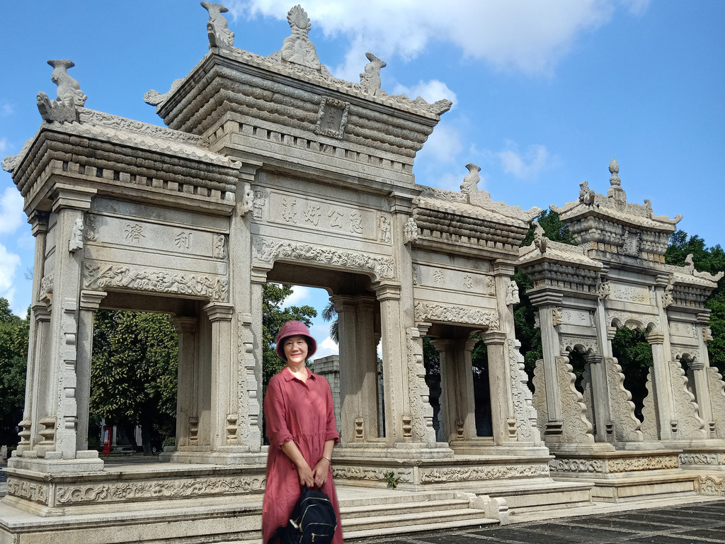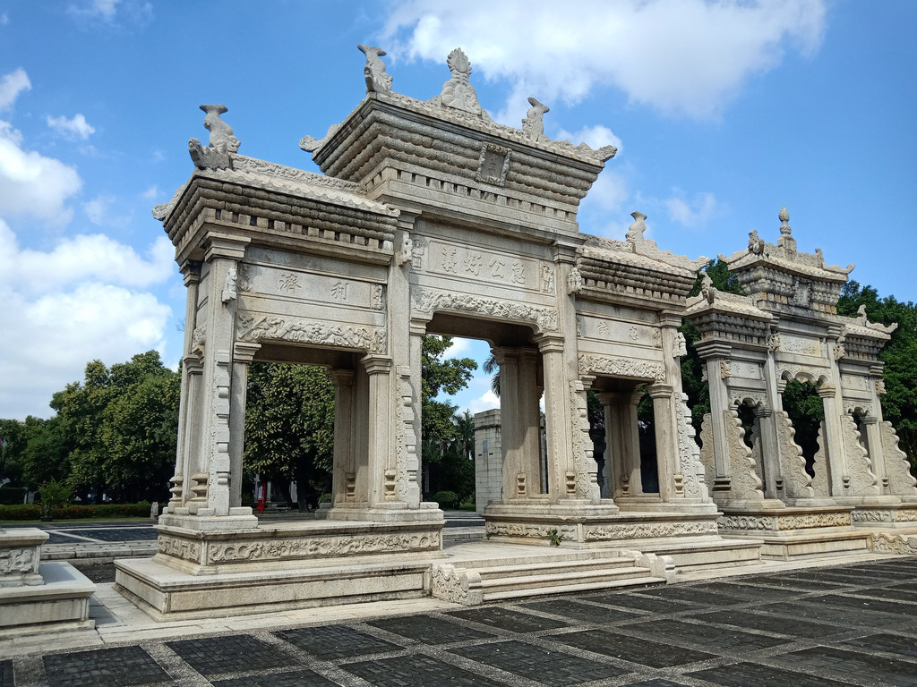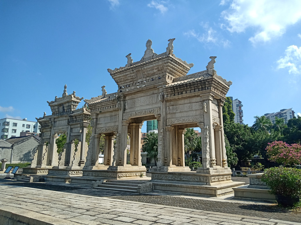 中间一座建于1886年,这一年珠海发生特大水灾,很多村民流离失所、无家可归。远在异国他乡的陈芳接此消息,自己捐赠白银三千两寄回国内,请朝廷救济灾民。光绪皇帝听到奏报后,非常感动,即赐建石牌坊一座,以示褒奖。