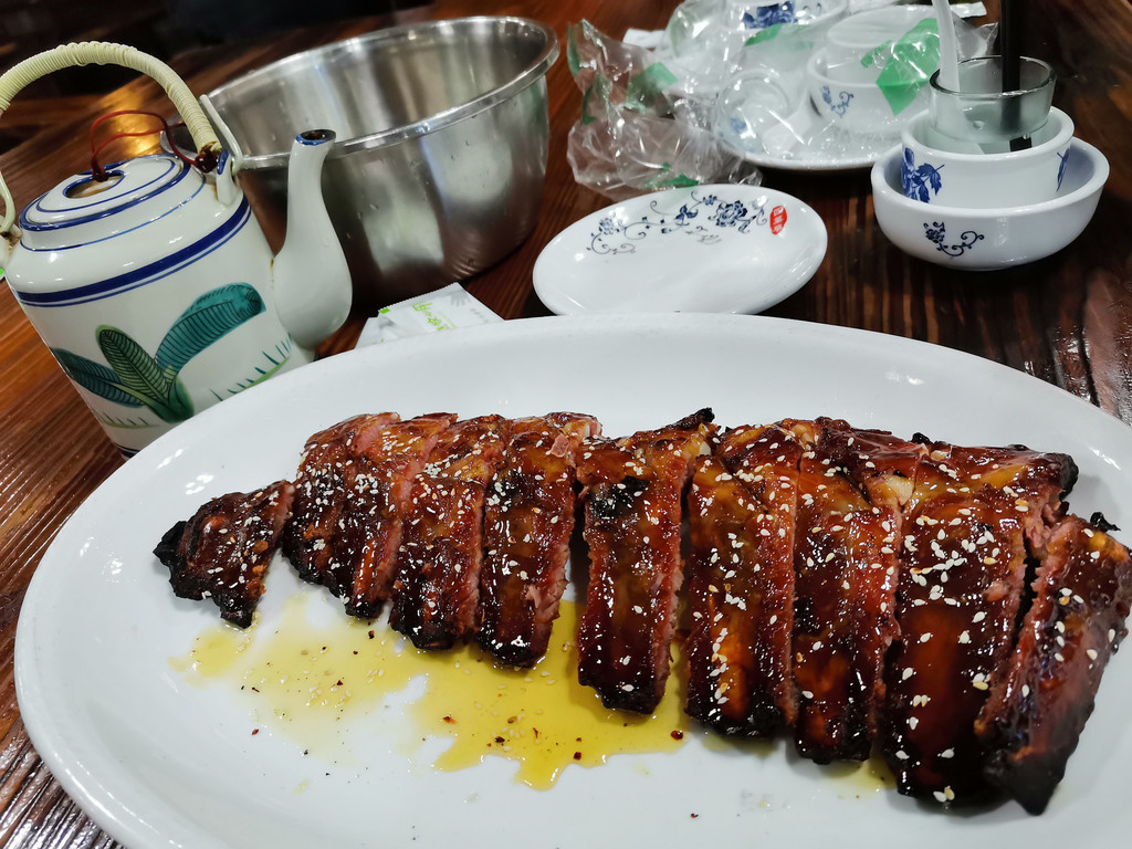 蜜汁烧全排。其独特之处就是用荔枝木烤的,端上来的时候那种烧烤的香味扑鼻而来,有淡淡的荔枝味,而且蜜汁超级入味,排骨肉面上有一层薄薄的甜甜衣,排骨上厚厚的肉,好吃。