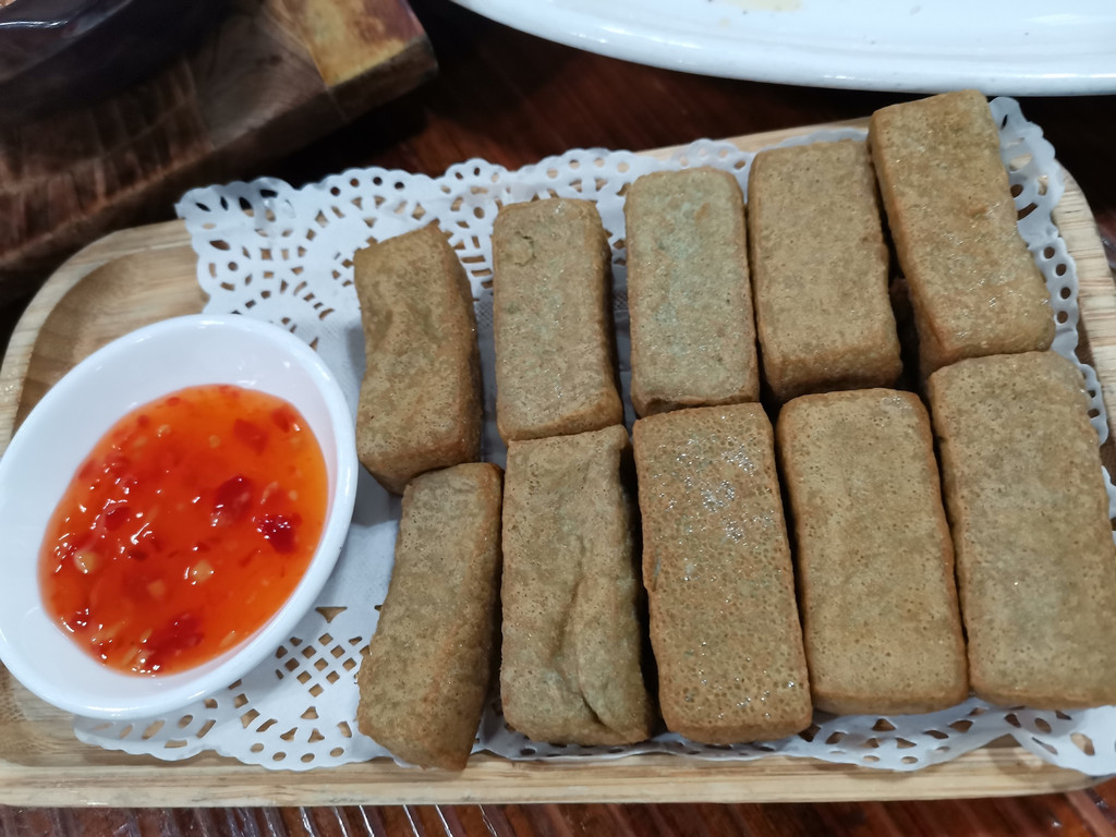 自制养生黑豆腐。外面炸了一层薄衣、里面很浓的豆香、又滑嫩,蘸上甜辣酱口味更佳,既好吃又养生。