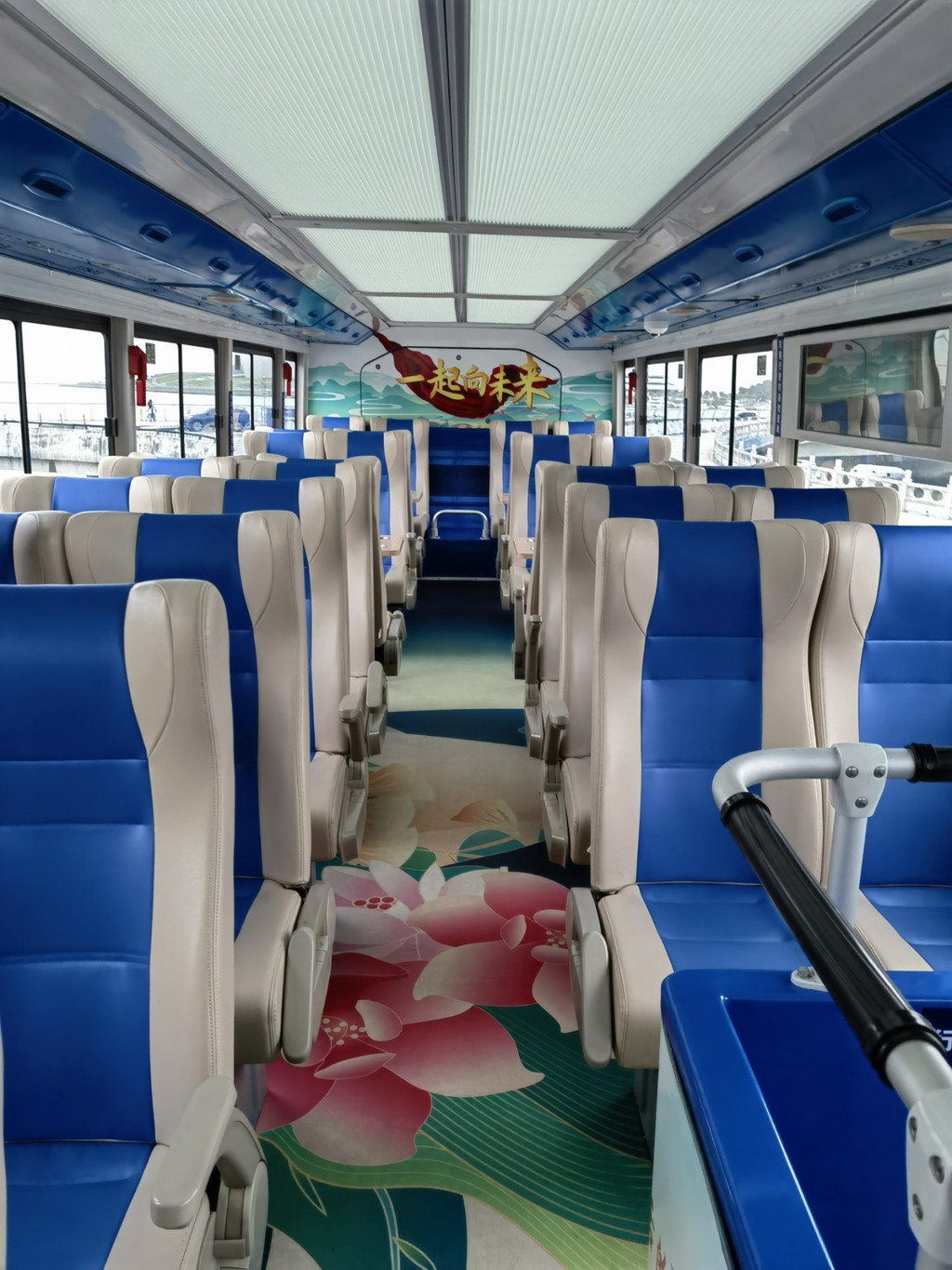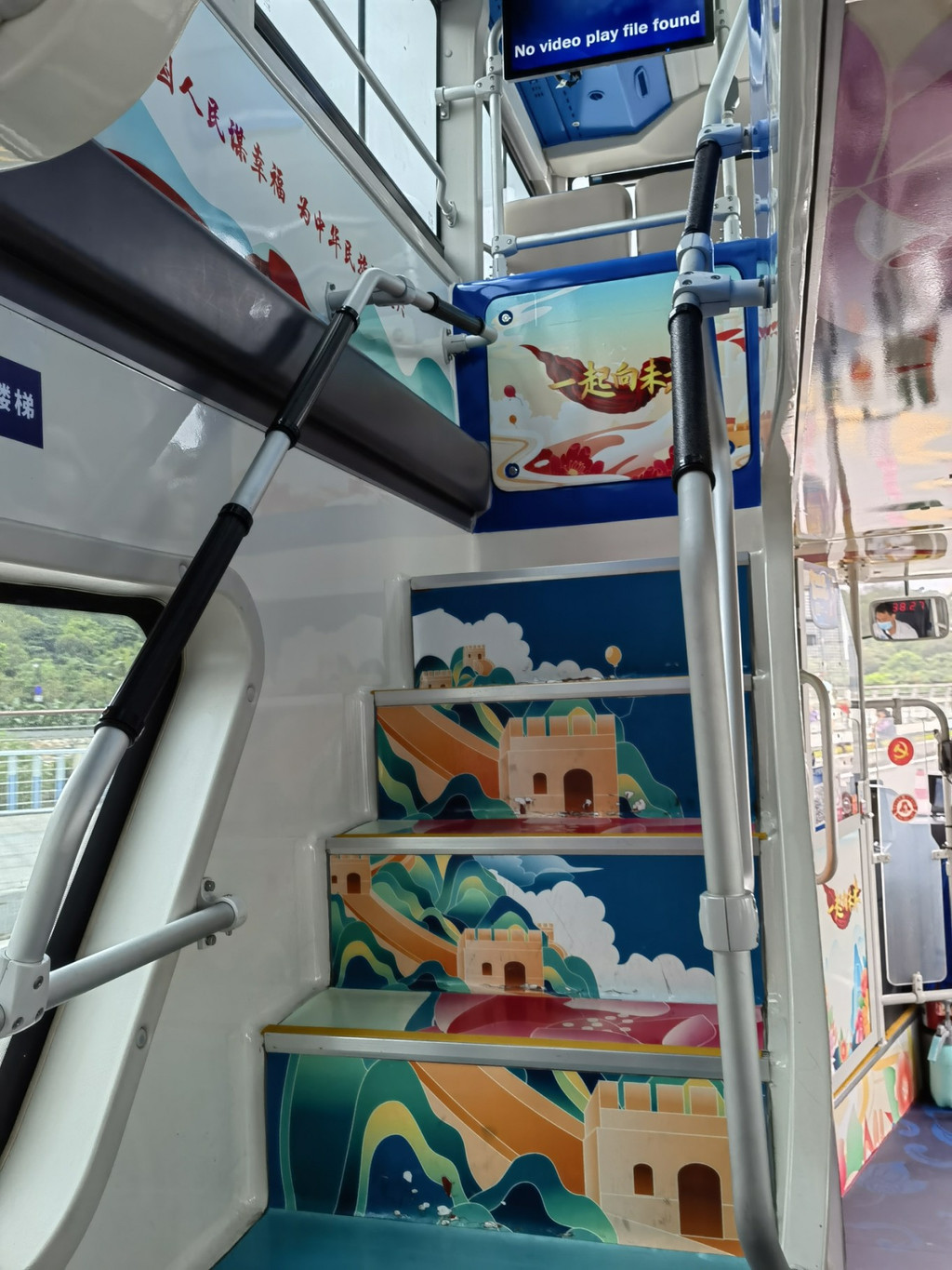 观光巴士里面设计的也很好看。一看就是为了旅游而设计的。就连这里的台阶都有了很好看的壁画。在车上有五个字“一起向未来”,看来,冬奥会前后,这里又重新搞了一下啊。