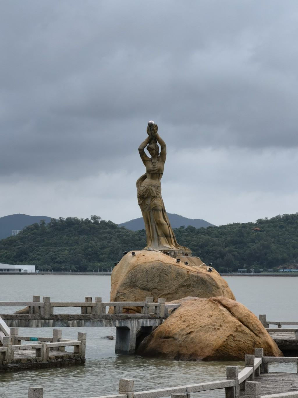 珠海渔女。看看这个大石头,感觉很有岁月的痕迹啊。珠海渔女就这样婀娜多姿的在海面上存在着。