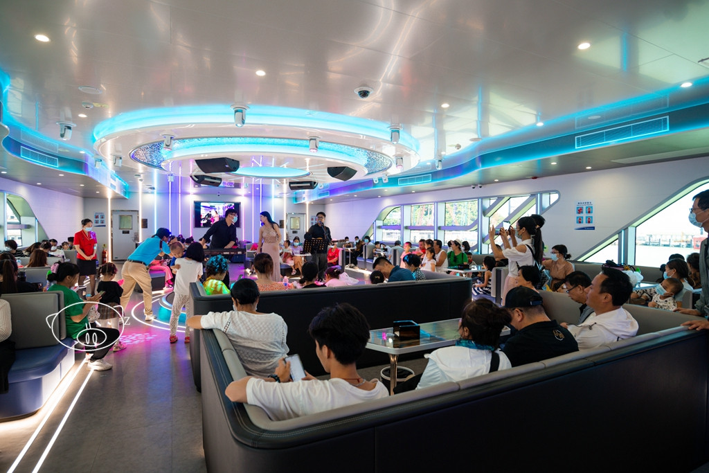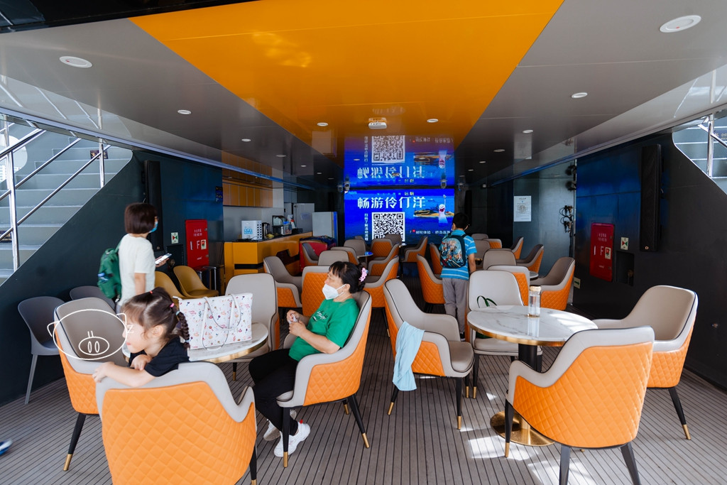 “大黄蜂”共分为四层,一层是舒适客座区,线型深渊灯与船体相融,船舱未来科技感十足。船内声、光、电、LED设施齐全,服务到位,免费对游客开放体感游戏体验及观看震撼大片。一层的玻璃窗是全封闭的,不过能通过通透的大玻璃看到外面的美景,下雨天、大热天等,也可以坐在舱内欣赏海上风光。