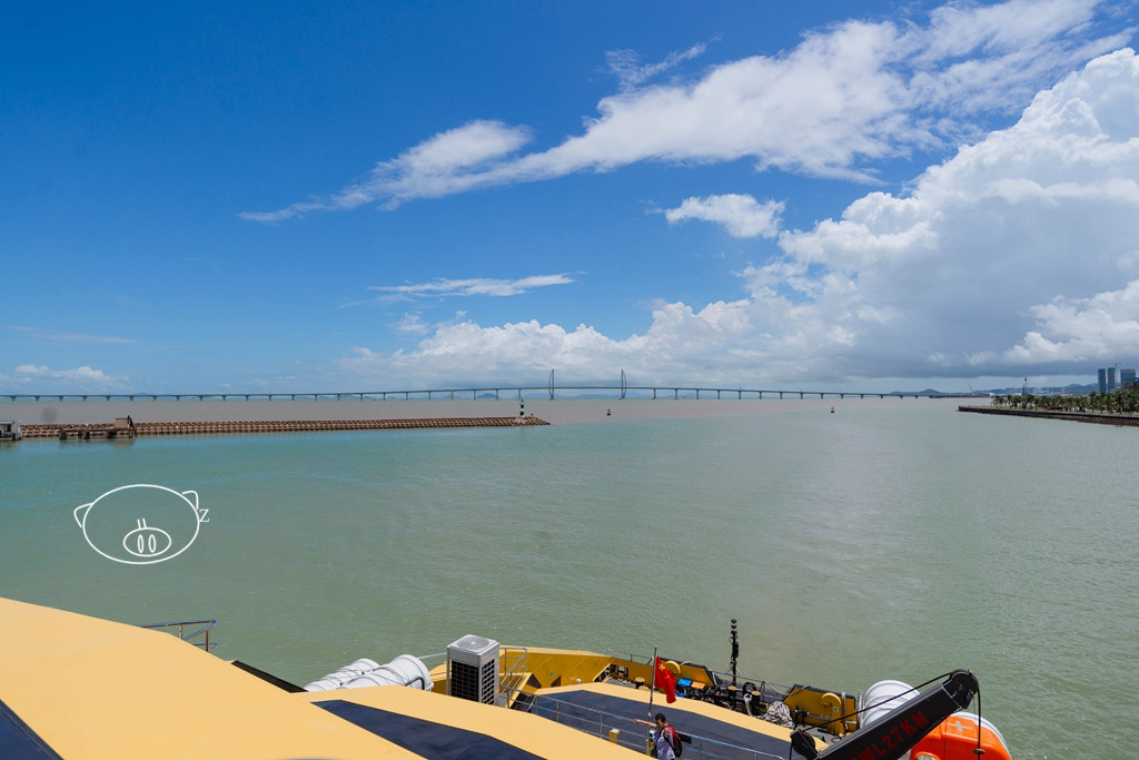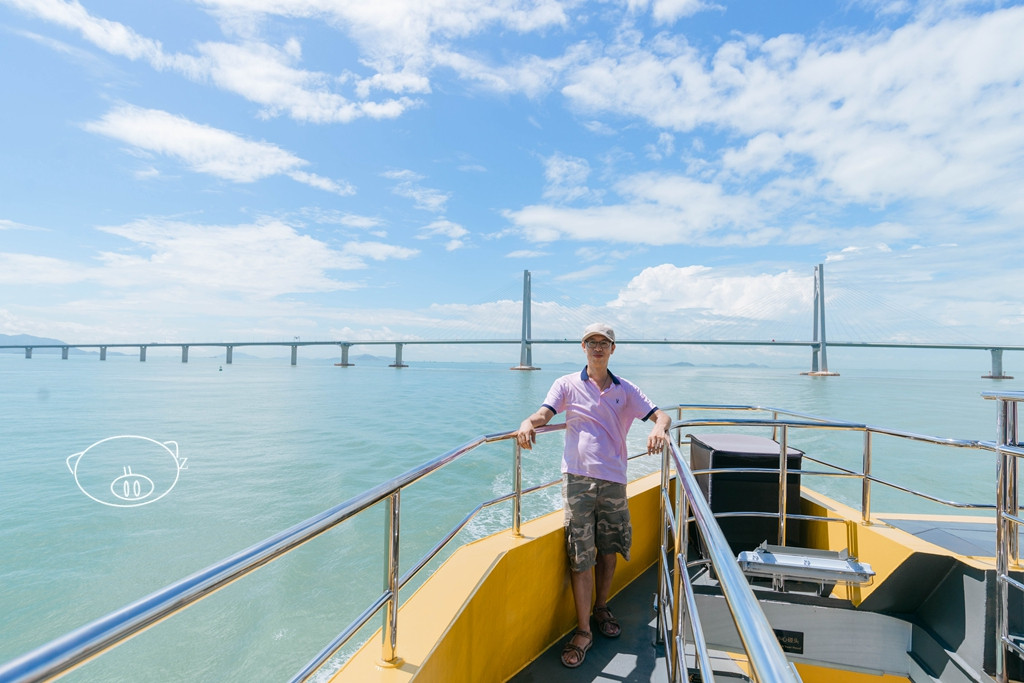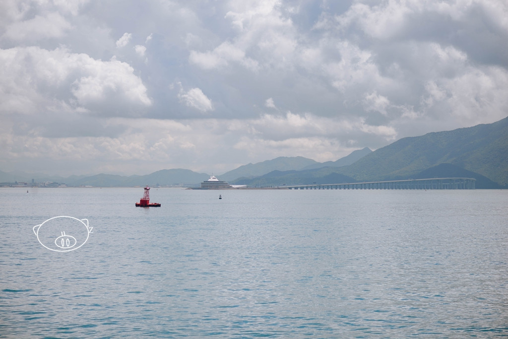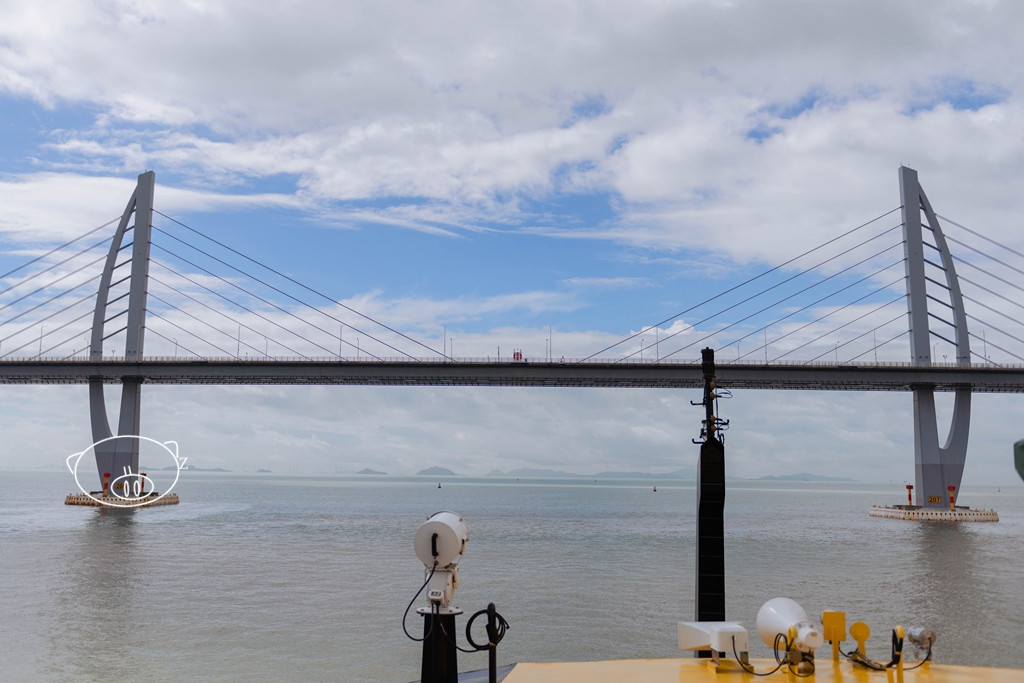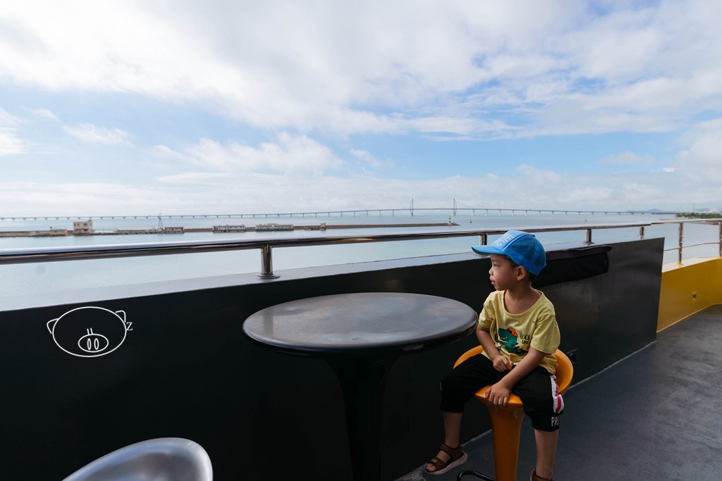 四层是360°全景露天观光平台,在这可以观景拍照、登高望远。甲板上配有圆台和高脚椅,可以坐着,拿上一杯饮料,吹着爽爽的海风看海景。嘻嘻,小猪已占领有利位置,看着外面的海上的船只和远处的港珠澳大桥了。