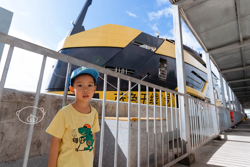 哇哇哇,看到了看到了,码头上停靠着的奢华游船“蓝色干线1号”,是九洲蓝色干线精心打造的豪华游船,以“黄+黑”色彩搭配,外观刚劲有力,极具科技机械风的设计,被媒体喻为海上“大黄蜂”。不是说每个小男孩心里都住着一个机器人么,酷爱机器人的小猪也不例外,马上叫爸爸帮他拍上一张合照。