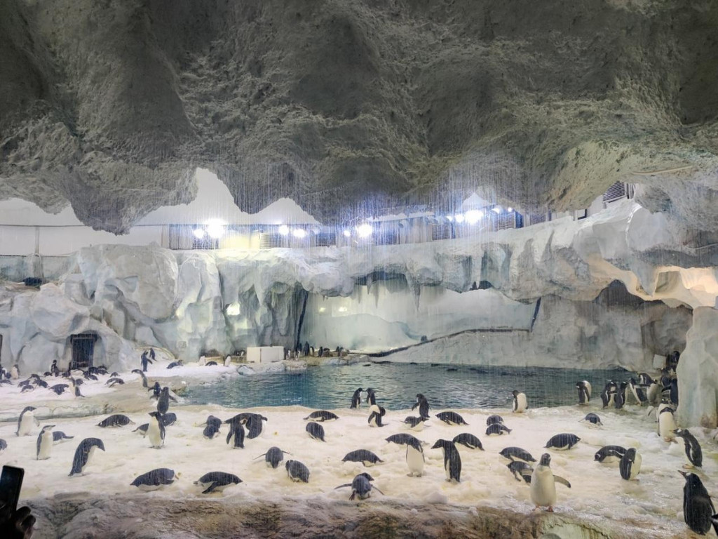 场馆真的超级大。看看这个企鹅馆,真的算是很大了,甚至还做了冰川的设计。这些企鹅们动起来真是一点都不笨拙啊。歪歪扭扭的身子,一下子就跳到了海水里,然后在里面痛痛快快游玩起来了。