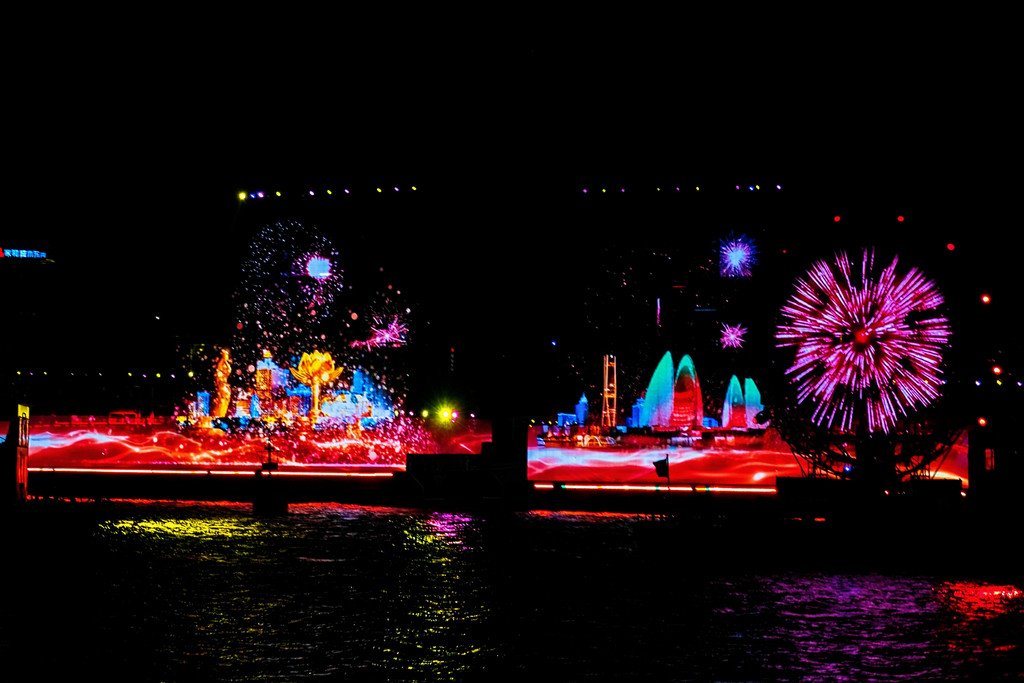 航线特色:这是全球首个海上沉浸式无边界剧场,集科技性、趣味性、文化性于一体。6艘小船+2艘大船组成的巨型移动幕布,利用数字灯光、三维影像等方式进行演绎,为我们讲述了一个跨越三代人,关于“一诺千金”的故事,现场无论是视觉还是观感都令人震撼。