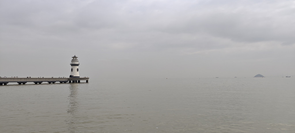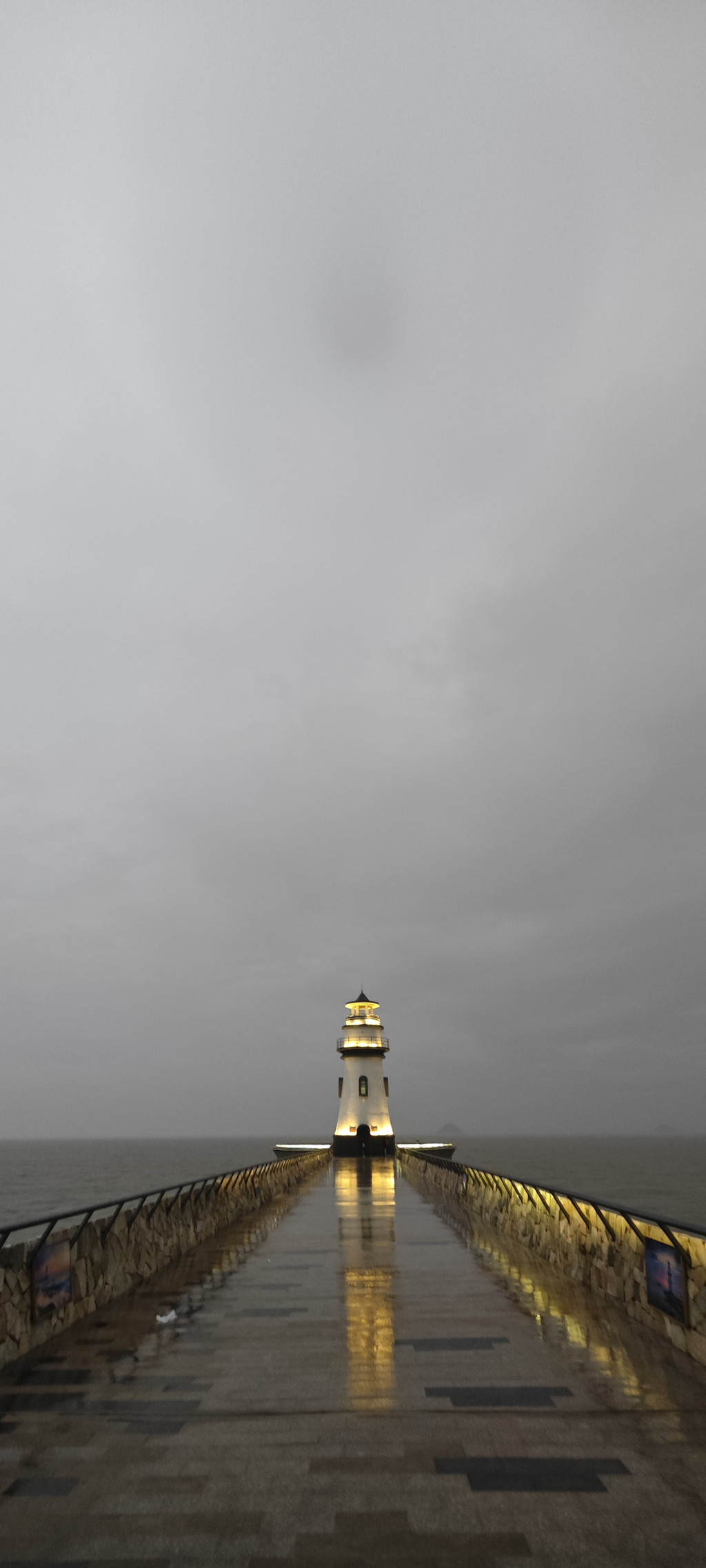 天空比日常更早的昏暗下来,预示着有雨要下。零星的雨点开始落下,滴打在街上的行人头顶,让人不知是否需要开伞。当我踩上海滩的沙时,这场大雨终于肯从云间落下,撒进海水里,落入金沙中,泼向道路上。一场酝酿已久的阵雨驱散了沙滩上游玩的人群,让人猝不及防的向可避雨处逃去。没多久雨水渐停,雨打树叶的声音也停止了,海浪拍打声”哗啦”又起。不知谁又无视管理下了海,安全员拿着喇叭大声叫着让他上岸。阴暗的下午没有夕阳,看不到日落的余晖照耀在大海水面的景色,但是在这昏暗的景色中远方白色的灯塔平淡中有一股吞噬人的寂寞,这白色大海萧瑟的足以杀人。夜色渐暗,天边的海平线亮起了一串光点,将天边平直的黑线变成了一串虚线白点,其间还有个别单独的光点在移动,那是港珠澳大桥夜晚的疯狂。