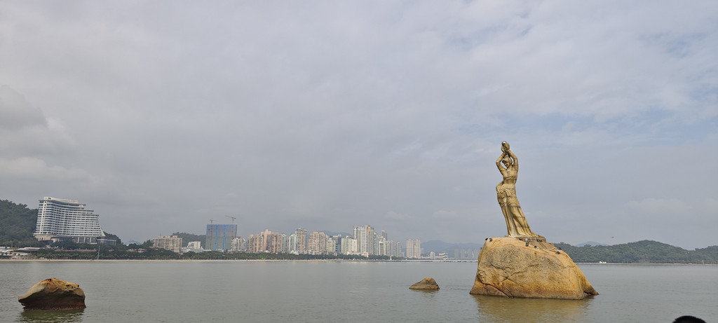 我沿着这条沿海路一直走,看着这座城市最闲散的一面。一条漂浮在水面上的小海龟尸体正在被四、五条小鱼苗啄食,旁边不远处漂浮着一条更大的鱼的尸体,今天小鱼们似乎不用担心伙食的问题。路旁绿化用的椰子树结出青葱的椰子,有大有小,看着酸人牙齿,如果掉下砸在某人的头上一定很痛。珠海渔女雕像是属于年长者们的网红景点,此处代拍的数量比其他景点都要多许多,没有代拍问我是否需要拍照,我似乎被他们屏蔽了,常年在此地进行代拍服务的人知道什么样的游客会需要代拍服务,也懂得如何去跟年长者们讨价还价。
