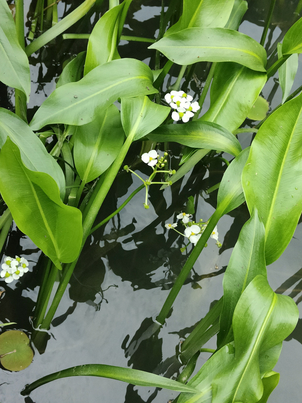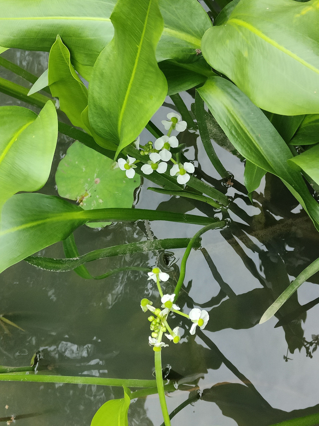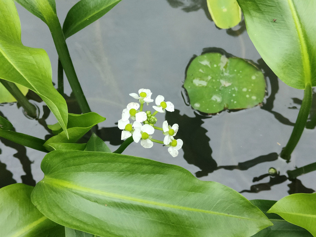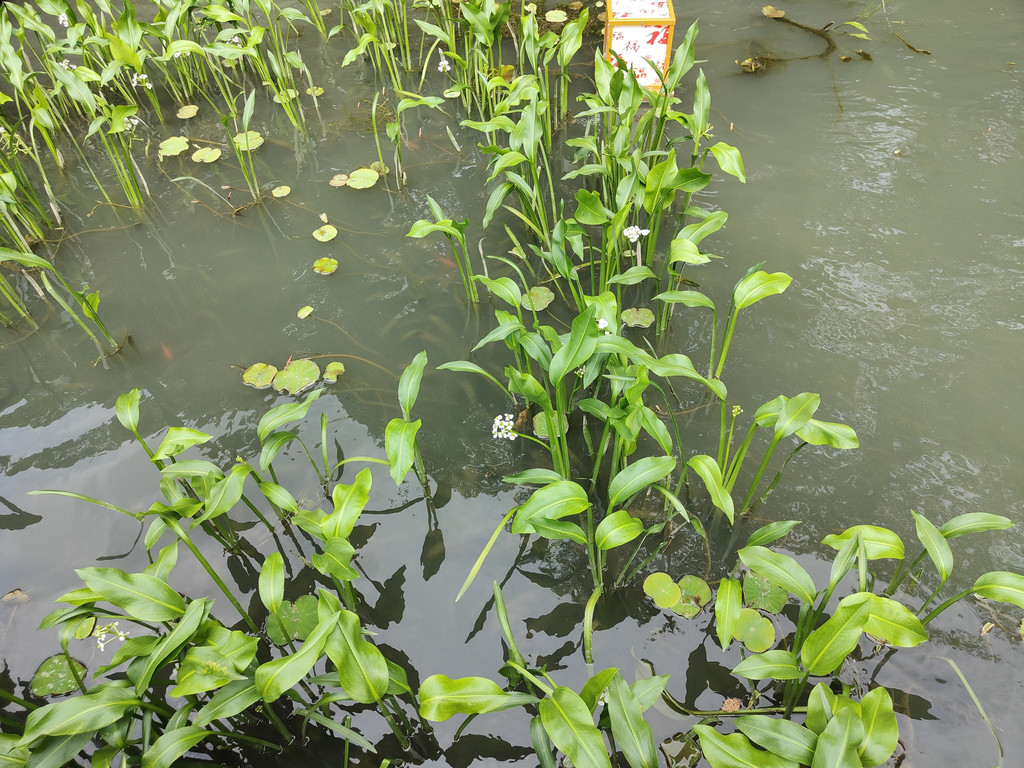 泽泻是泽泻科泽泻属的多年生水生或沼生的草本植物,我知道泽泻是因为它作为中药名,因为能够利尿行水,如泽水之淀,因而得名。它的叶片很茂盛,呈水叶条形或披针形,挺水叶宽披针形、椭圆形至卵形,其实叶片也挺好看,可以作为观叶植物栽培。花葶高出水面大概有几十厘米,可惜今天池塘的水位太低,所以大多数的花朵还不及河岸的高度。