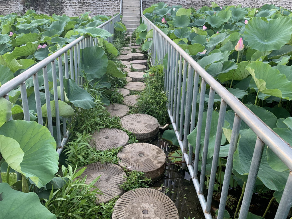 路确实有一点点绕,司机师傅从站点出发带我们拐了好多弯,在平坦或是不平的道路上行驶了大约半小时才到。一进村子便见到了满池的荷花,估计荷花的种植面积可以和四五个农家小院的占地面积相媲美了,一座干净平坦的实心小桥将荷花池与旁边的墨水池分开,有着两边黄色小花装饰的桥上坐着几位老人家,她们挥着扇子聊着家长里短,问她们村子有什么景点的时候还笑咪咪地、自豪地夸赞自己的村子,让我一度怀疑她们是被专门安排到这里给村子作宣传的。