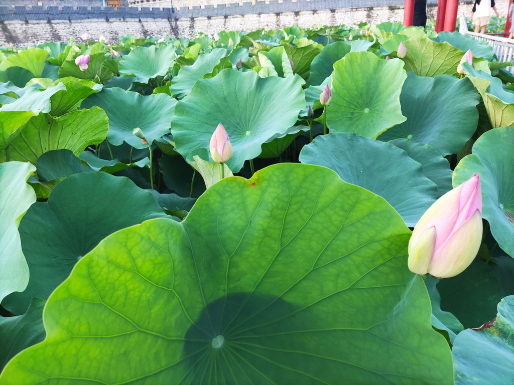 我和朋友顺着小路进荷花池的时候已经有几个游客在心形门、小凉亭拍照了,叉腰比耶的姿势交替着,墨镜、油纸伞也被用来进行各种摆拍。只得加紧脚步,抢占采光好、有标志性建筑的地方抓紧拍照。