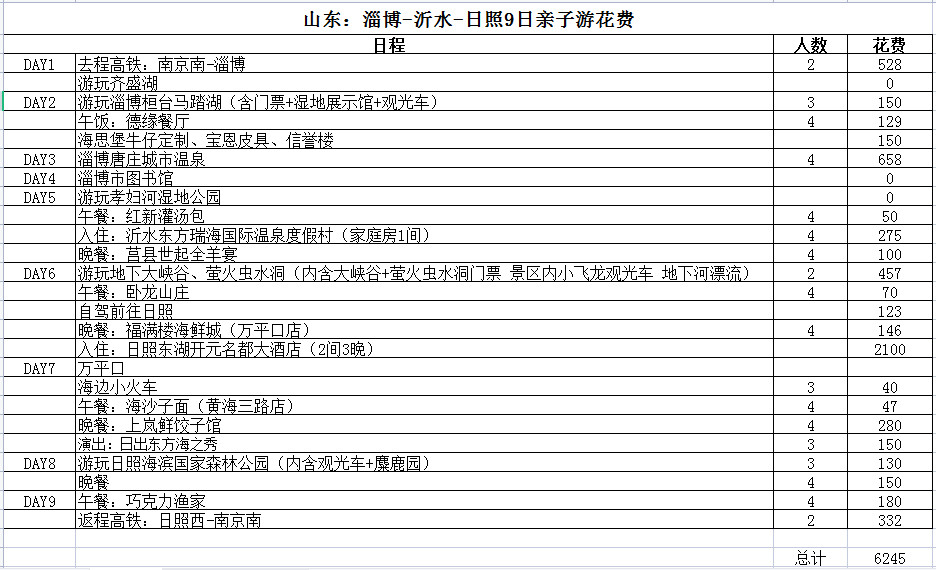 趁着回家探亲,带2岁半的宝宝在淄博-沂水-日照玩了9天,旅行中安排了温泉度假、地下河漂流、看萤火虫、近距离蝴蝶观赏、动物喂食参观、海边小火车、挖沙等与宝宝互动性强的项目。高铁到淄博后自驾至沂水-日照,最关键的是全程自驾车程没有超过两个半小时的路程,长途自驾都选在宝宝下午午休时,宝宝上车就睡,无痛带娃!山东的物价真的很低,三大一小9天花费全程未过万,适合想经济出行的家庭。后附消费明细表。