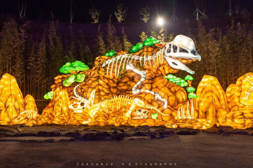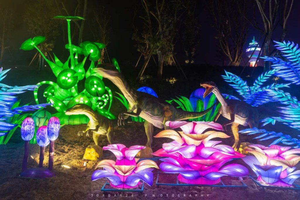 “奇幻侏罗纪”灯组演绎了陨石坠落、生命起源、穿越时空回到过去的故事场景,穿越三叠纪-侏罗纪-白垩纪三个时代的奇幻历险记。