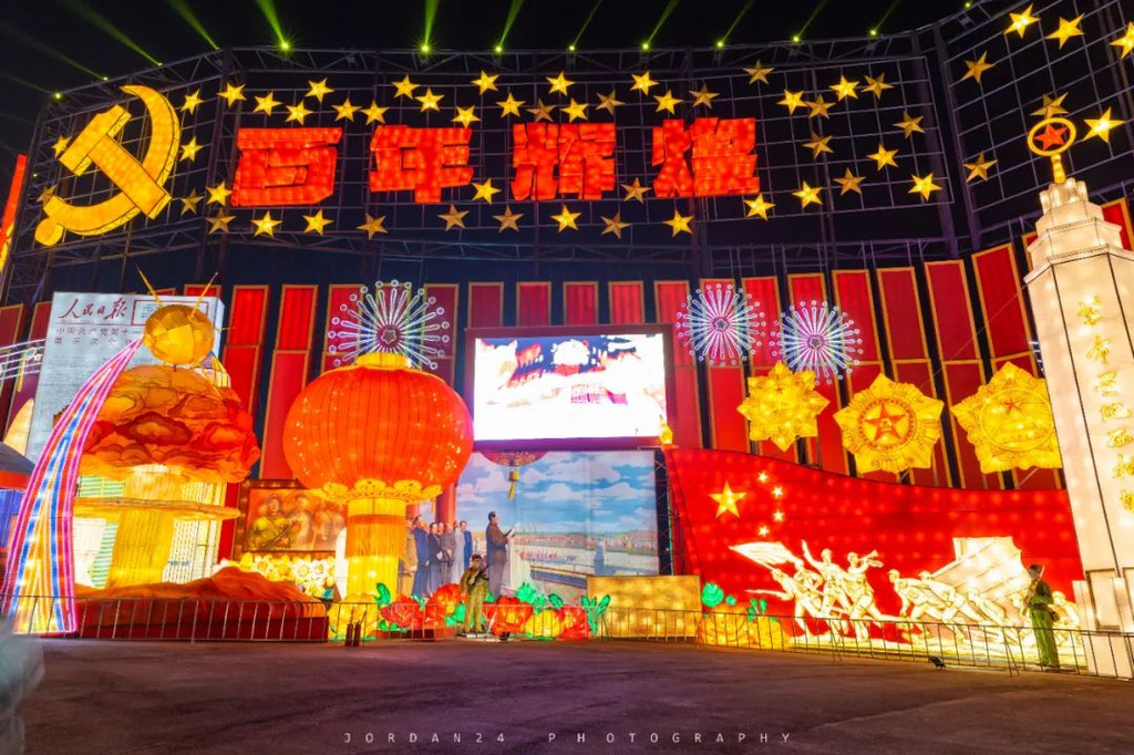 210米的巨型长卷灯群讲述了在中国共产党的带领下,中国人民从站起来到富起来、再到强起来的过程。