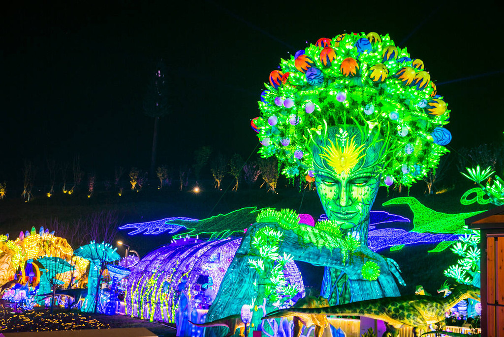 【奇幻侏罗纪】围绕“恐龙时代”主题打造穿越时空的梦幻场景,融合亲子互动、科普互动、光影互动等内容,让人身临其境。网络爆红的一对迷人眼神的彩灯女神就在这里。
