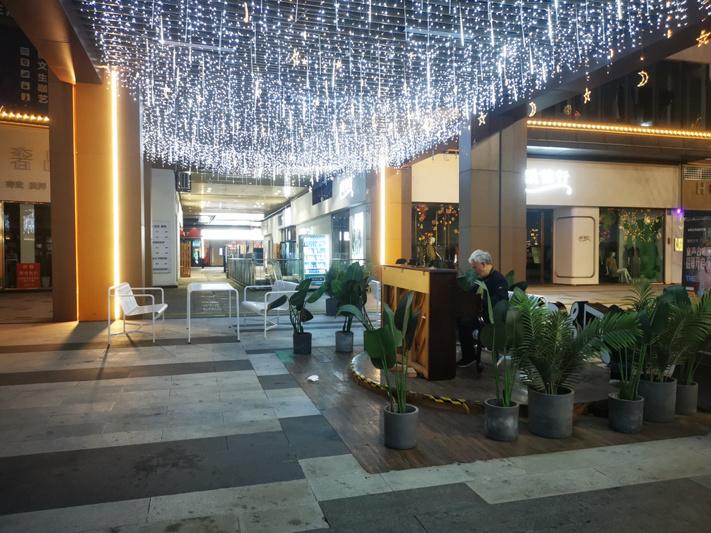 民宿在自贡新城区华商版块,还是挺热闹的,偶遇一位老爷爷在星光下弹琴。