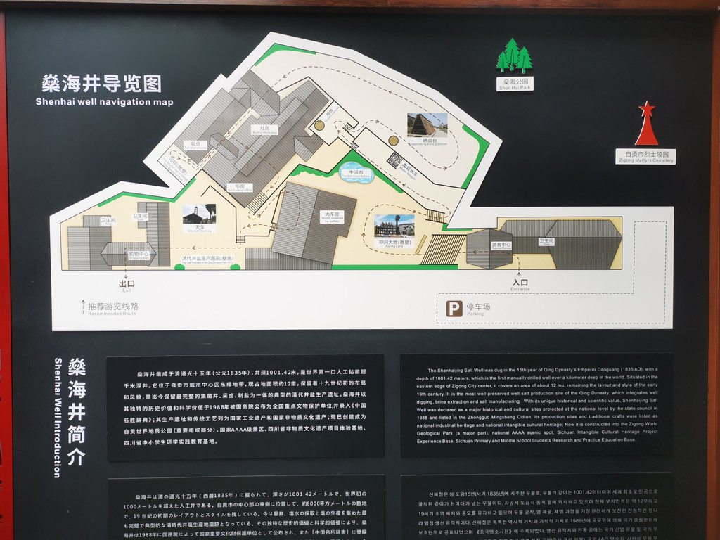第二个点位燊海井,相传是清道光十五年(1835)采用中国自宋代以来的传统技术冲击顿钻法凿成,井深达 1001.42米,是当时世界上第一口超千米盐井。