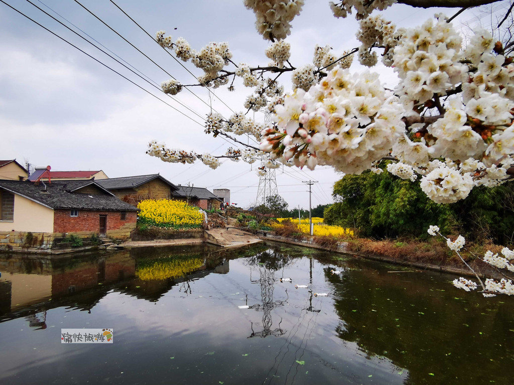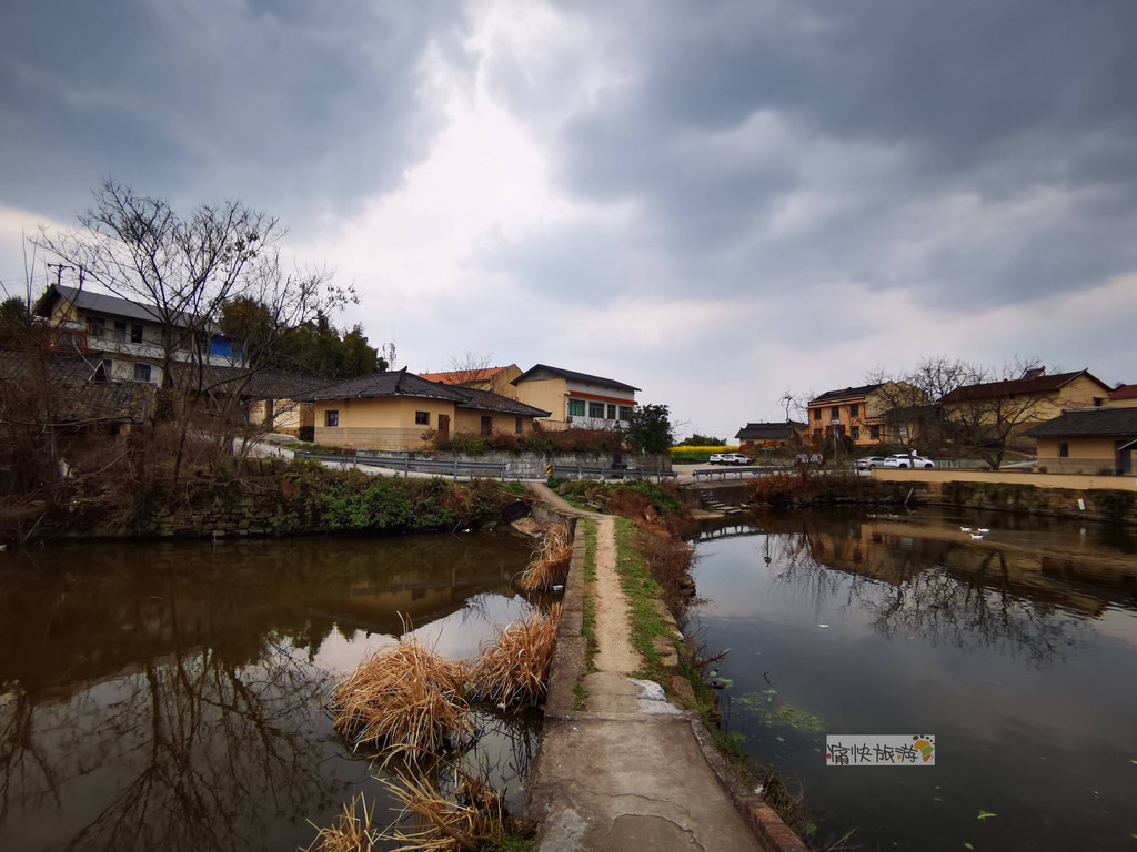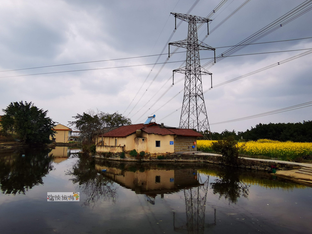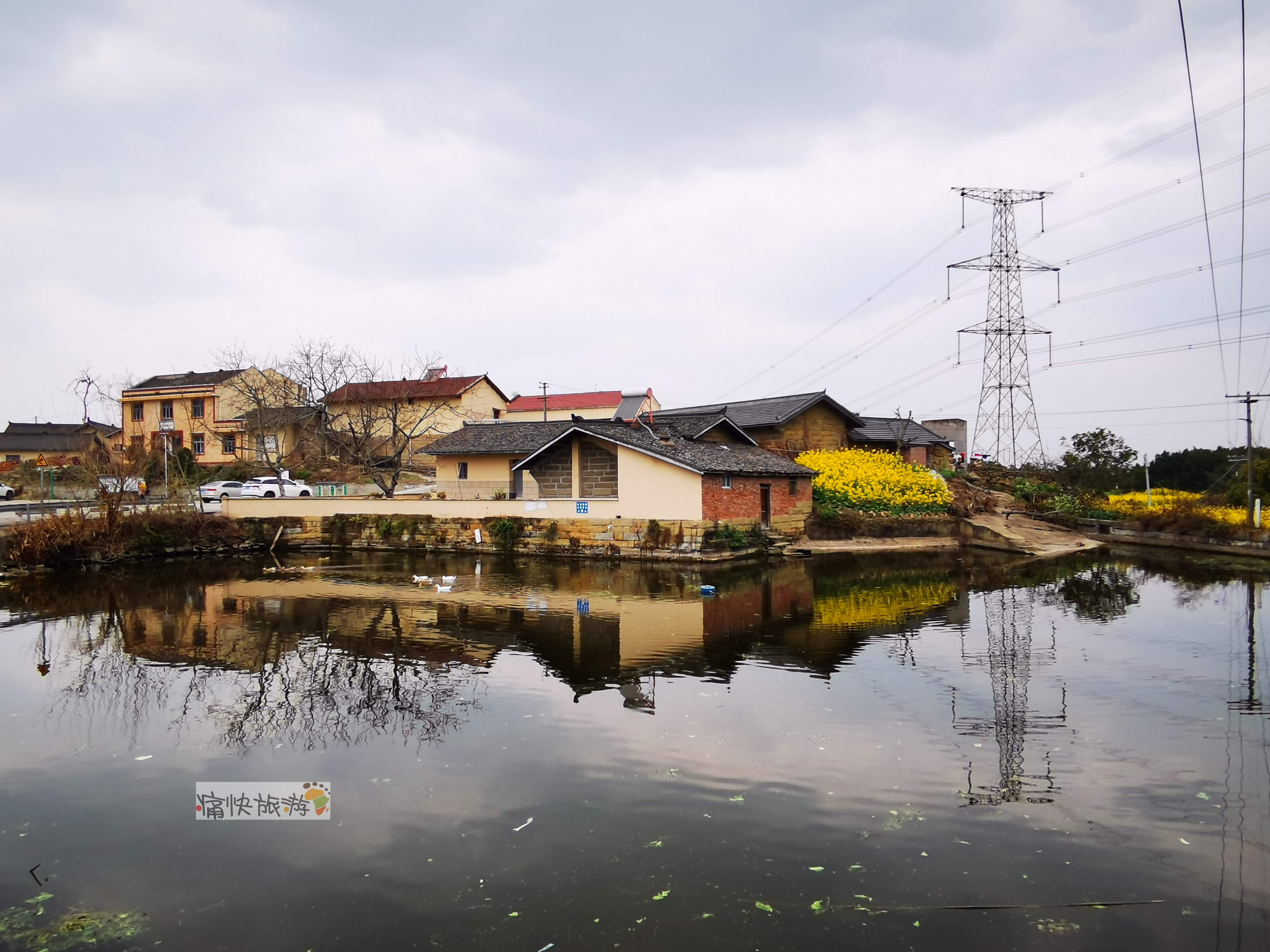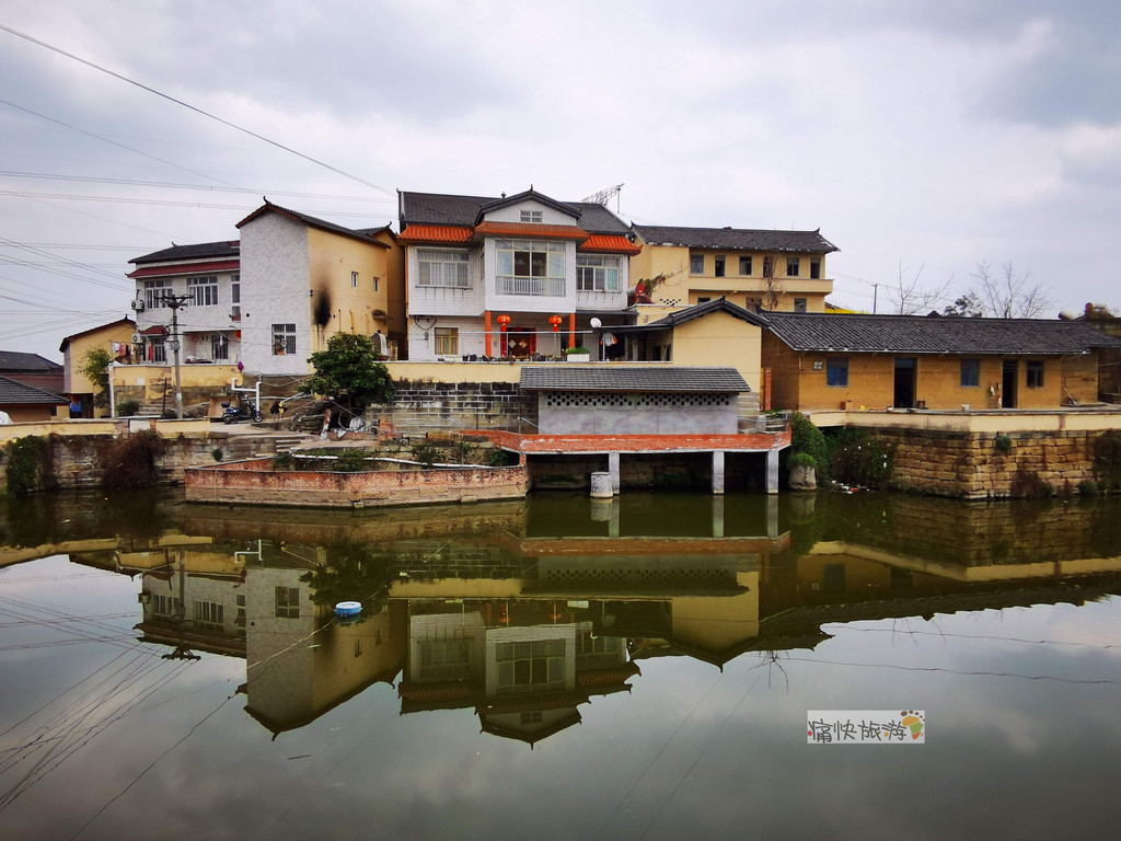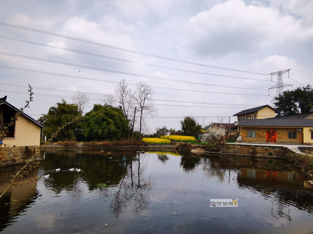 传统村落内地形起伏不大,民居建筑相对集中,其间农田和堰塘镶嵌,房屋高低前后错落。堰塘将天空、民居、农田、铁塔等倒映其中,春风过处、波澜不惊,既包罗万象,又充满了生机。
