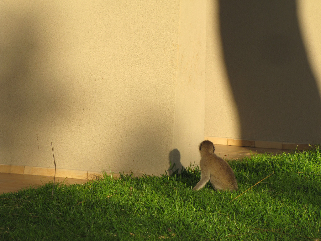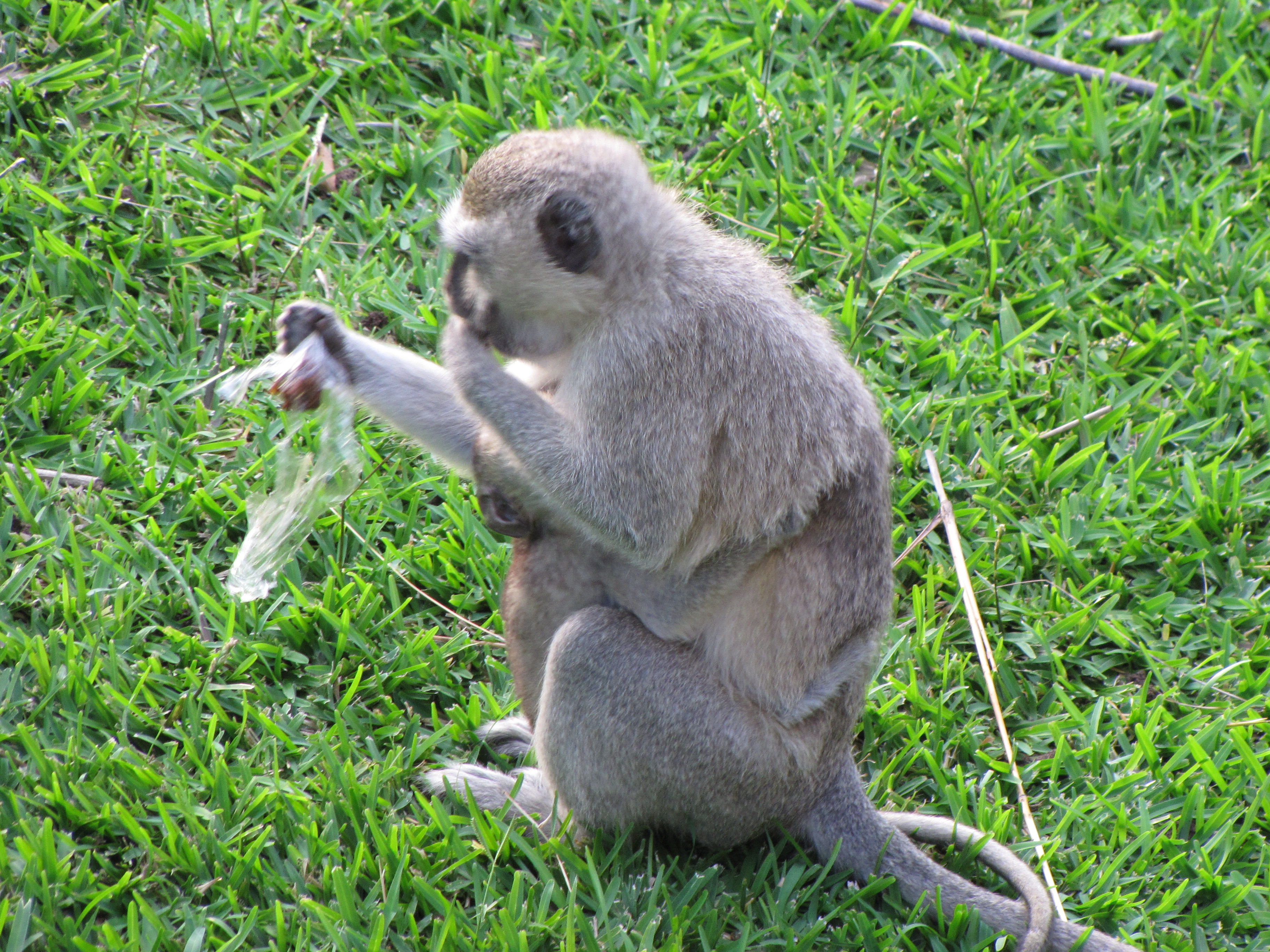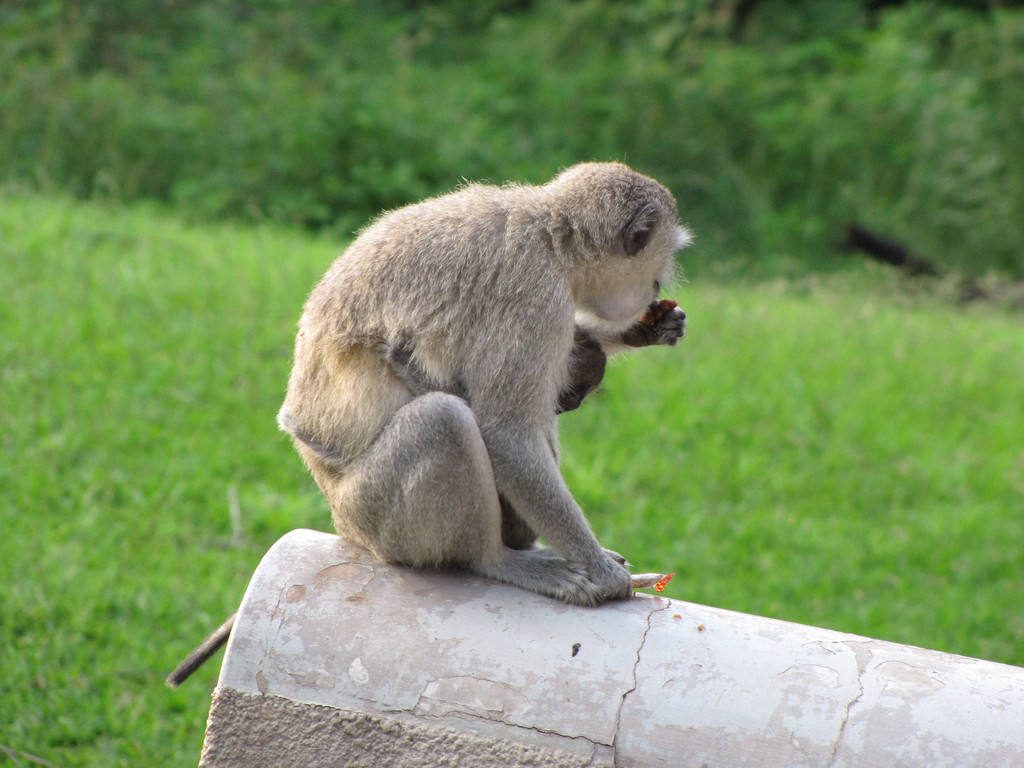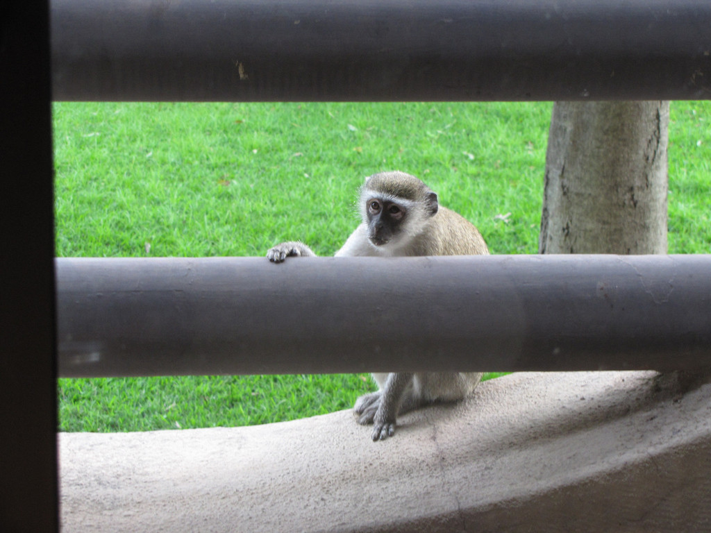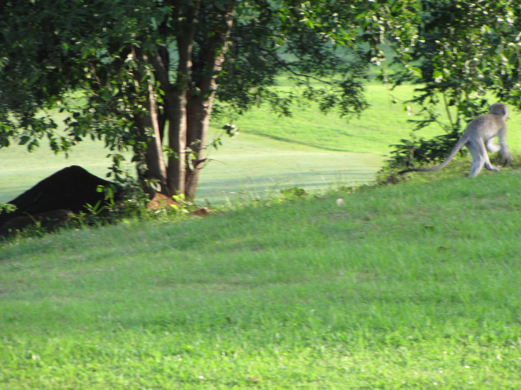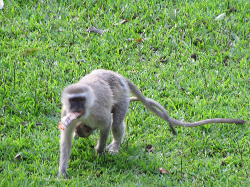 宾馆的晚餐是露天的,虽然很简单的英式饭菜,一个没有留神,餐盘里面的土豆条就不翼而飞了,满脸狐疑的我觉得是幻觉,陪同我们来的吴副武官开心😁的告诉我,你的土豆条在树上,抬头看去,一只猴子🐒正在树梢上抱着从我的餐盘里抢去的土豆条,大快朵颐,好不愉快的神情,让我永生难忘。没有想到,过了二十三年的2011年,我与妻女再次来的时候,我在宾馆的房间里又遭到猴子🐒的一劫,抢走了我自制的山楂丸,这是后话,尚且不表。